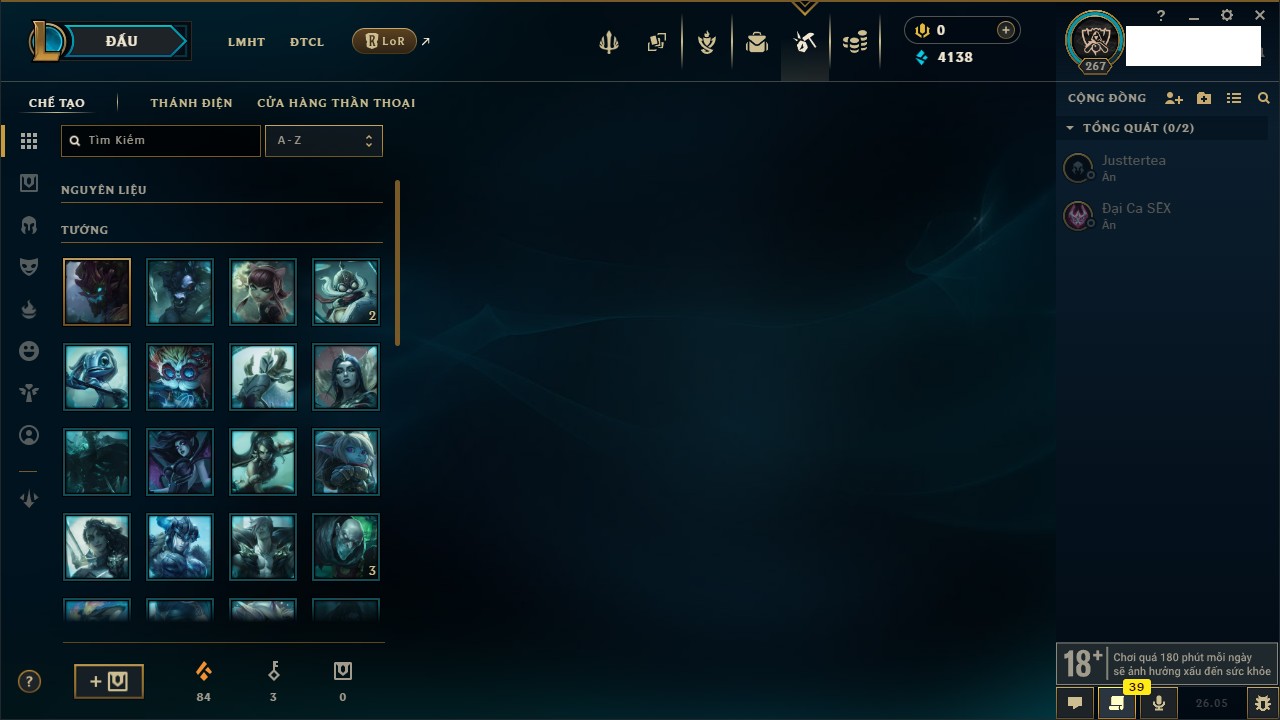 Rank Đơn: Chưa RankKhung: Chưa có khungTướng: 172 - Còn 81178 THXTrang Phục: 158Rank ĐTCL: Chưa RankLinh Thú: 85