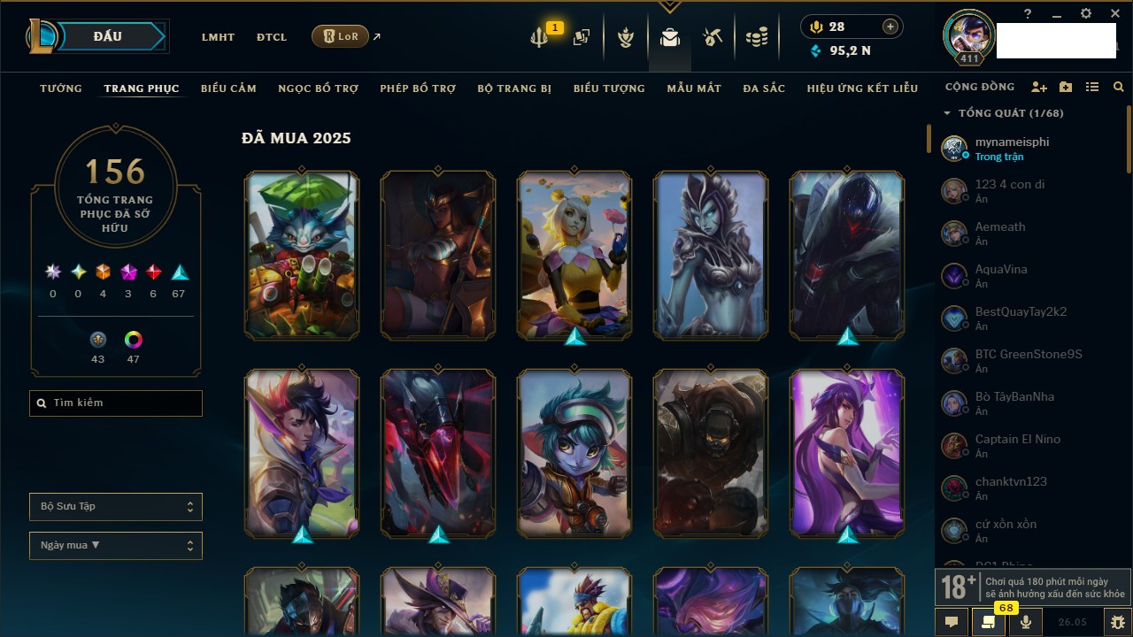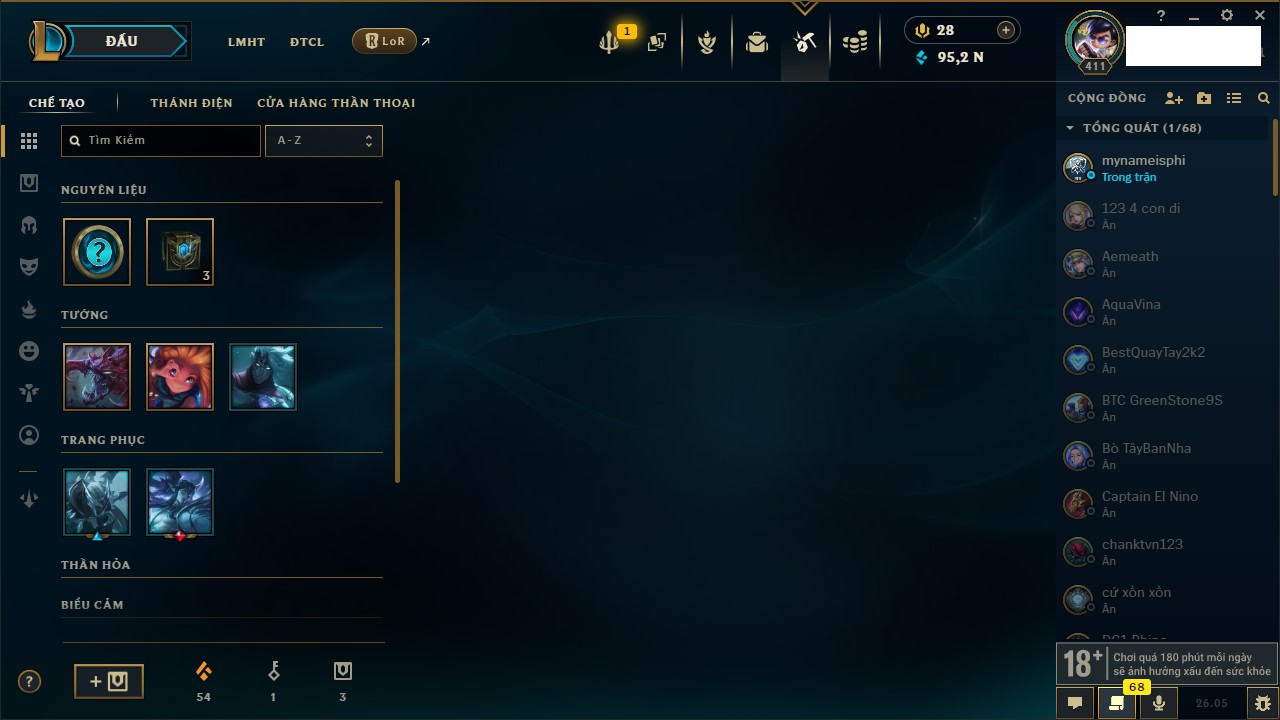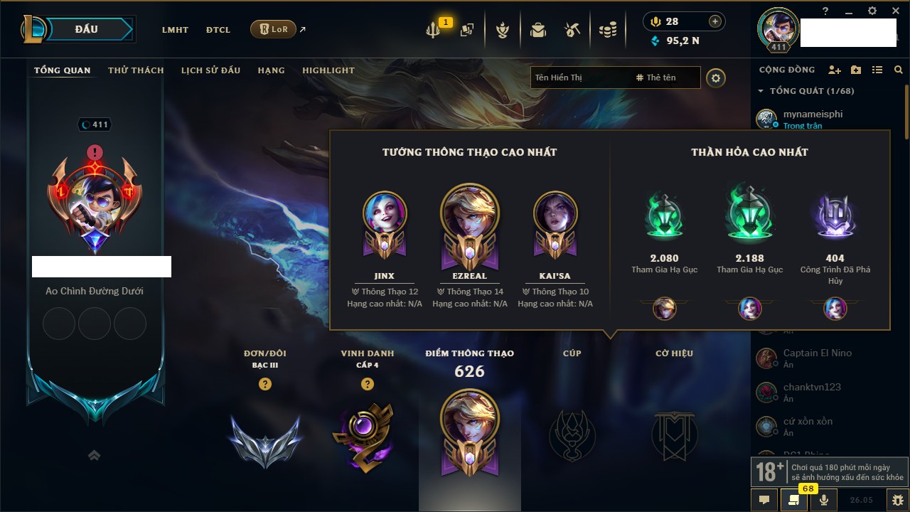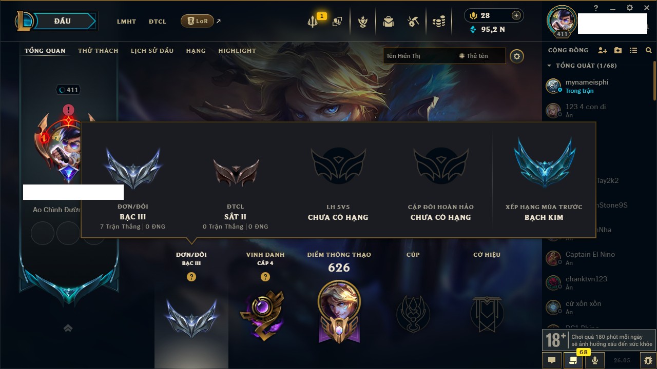 Rank Đơn: Bạc IIIKhung: VàngTướng: 172 - Còn 95276 THXTrang Phục: 156Rank ĐTCL: Sắt IILinh Thú: 42