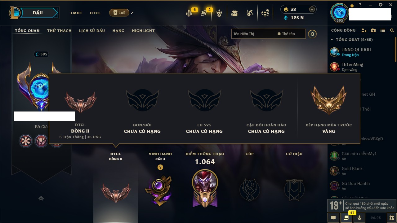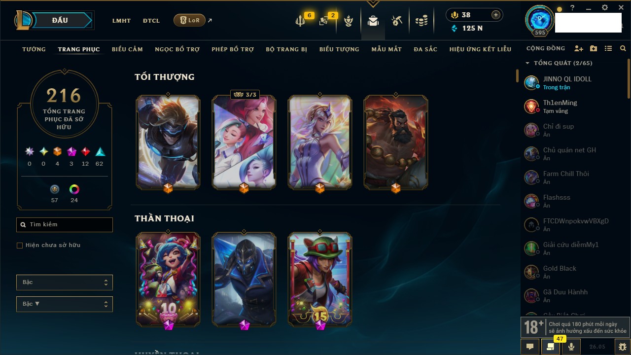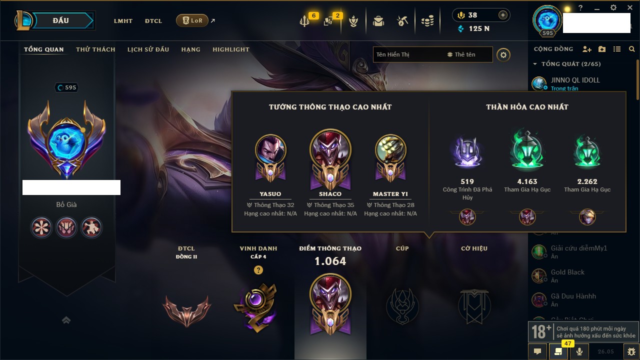 Rank Đơn: Chưa RankKhung: VàngTướng: 171 - Còn 125195 THXTrang Phục: 216Rank ĐTCL: Đồng IILinh Thú: 38