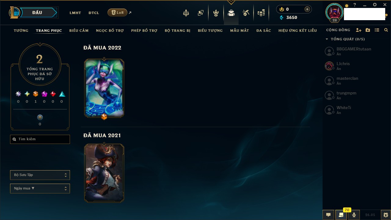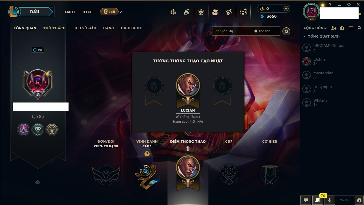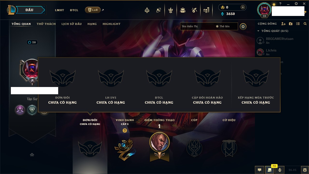 Rank Đơn: Chưa rank mùa nàoKhung: Chưa có khungTướng: 27 - Còn 2900 THXTrang Phục: 4Rank ĐTCL: Chưa RankLinh Thú: 24