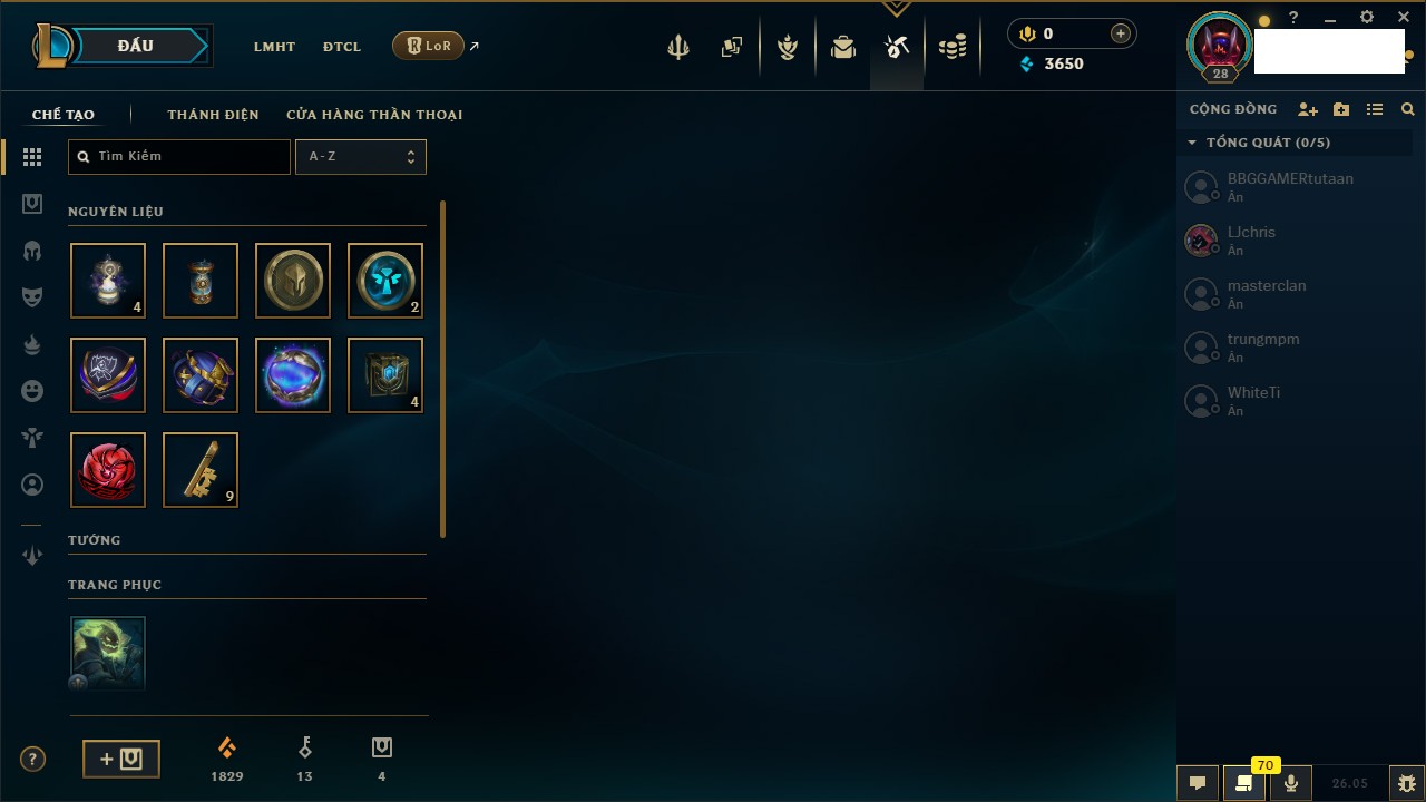 Rank Đơn: Chưa rank mùa nàoKhung: Chưa có khungTướng: 27 - Còn 3650 THXTrang Phục: 2Rank ĐTCL: Chưa RankLinh Thú: 33