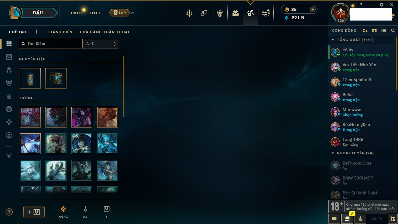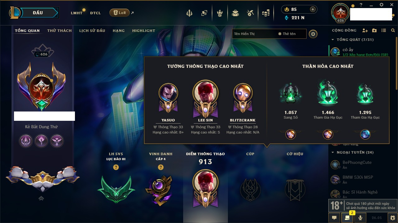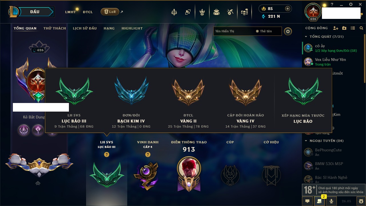 Rank Đơn: Chưa RankKhung: Bạch kimTướng: 172 - Còn 10879 THXTrang Phục: 288Rank ĐTCL: Chưa RankLinh Thú: 69