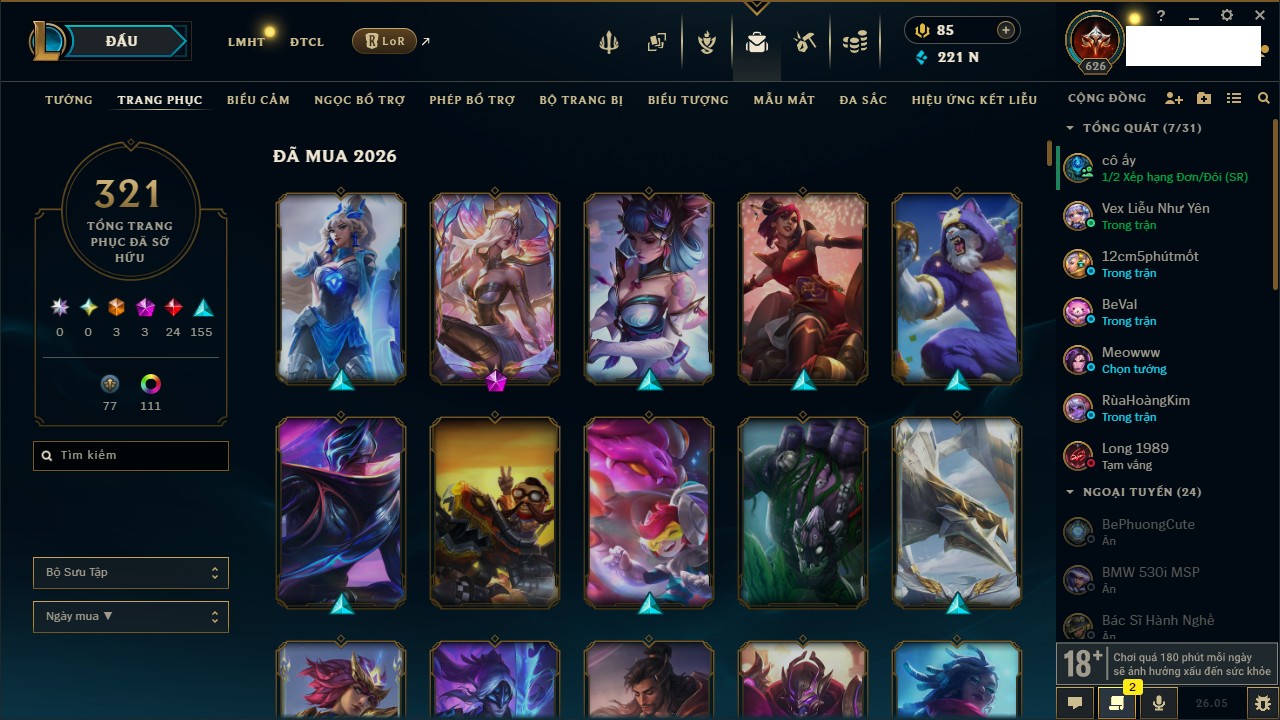 Rank Đơn: Chưa RankKhung: Bạch kimTướng: 171 - Còn 182788 THXTrang Phục: 158Rank ĐTCL: Chưa RankLinh Thú: 56