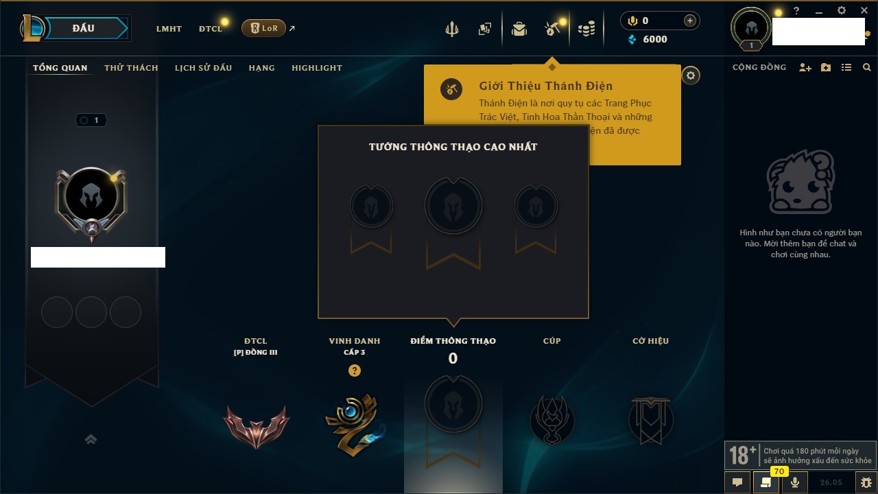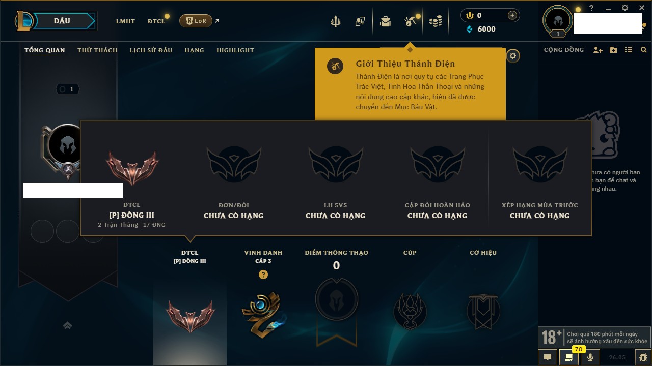 Rank Đơn: Chưa rank mùa nàoKhung: Chưa có khungTướng: 4 - Còn 20680 THXTrang Phục: 0Rank ĐTCL: Chưa rank mùa nàoLinh Thú: 15