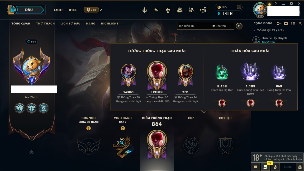 Rank Đơn: Chưa RankKhung: Bạch kimTướng: 168 - Còn 83003 THXTrang Phục: 210Rank ĐTCL: Chưa RankLinh Thú: 36