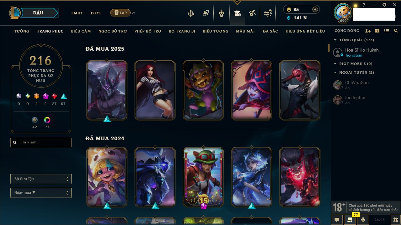Rank Đơn: Chưa RankKhung: Chưa có khungTướng: 172 - Còn 248311 THXTrang Phục: 233Rank ĐTCL: Chưa RankLinh Thú: 70