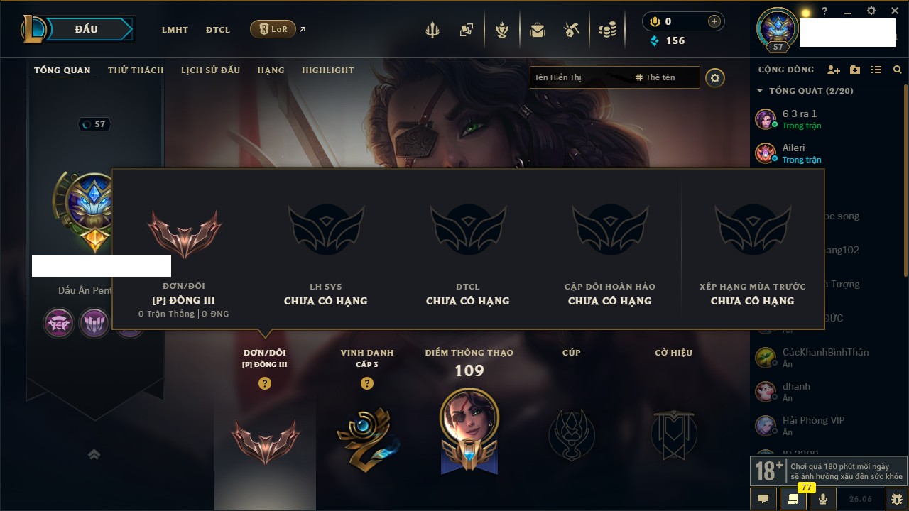 Rank Đơn: Đồng IIIKhung: Chưa có khungTướng: 39 - Còn 156 THXTrang Phục: 7Rank ĐTCL: Chưa RankLinh Thú: 10