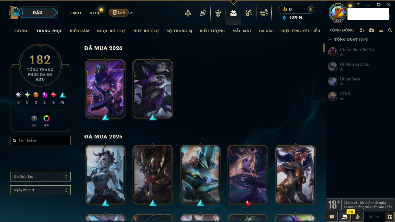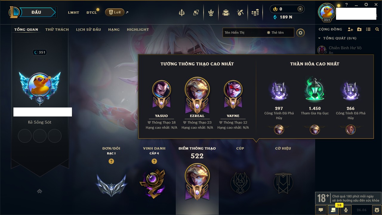 Rank Đơn: Bạc IKhung: Chưa có khungTướng: 172 - Còn 189559 THXTrang Phục: 182Rank ĐTCL: Chưa RankLinh Thú: 96