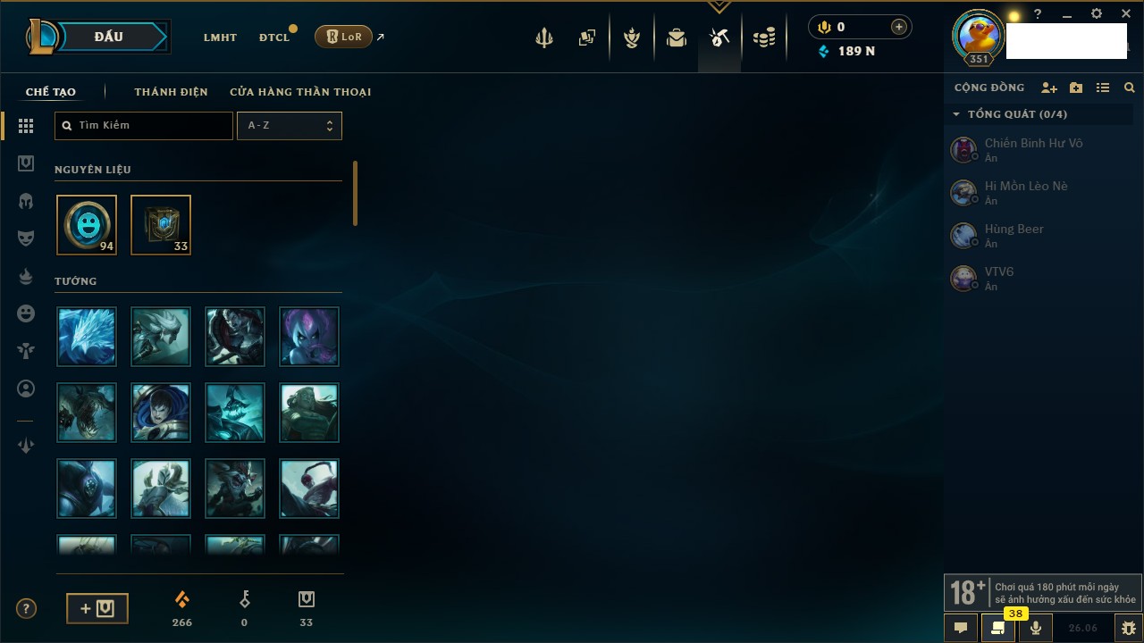 Rank Đơn: Chưa RankKhung: VàngTướng: 171 - Còn 125195 THXTrang Phục: 216Rank ĐTCL: Đồng IILinh Thú: 38