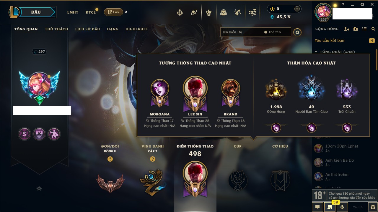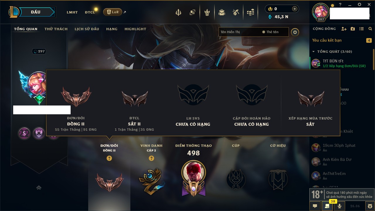 Rank Đơn: Đồng IIKhung: SắtTướng: 142 - Còn 45378 THXTrang Phục: 139Rank ĐTCL: Sắt IILinh Thú: 23