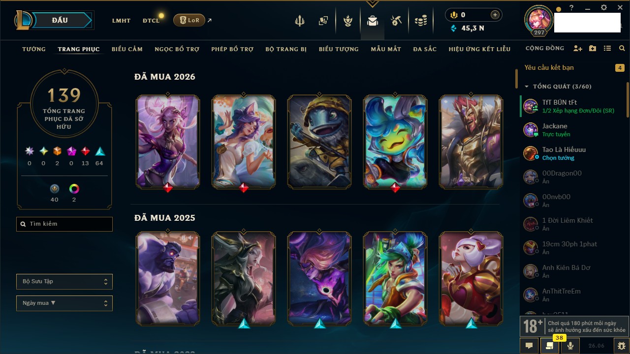 Rank Đơn: Chưa rank mùa nàoKhung: Chưa có khungTướng: 170 - Còn 75785 THXTrang Phục: 44Rank ĐTCL: Chưa rank mùa nàoLinh Thú: 100