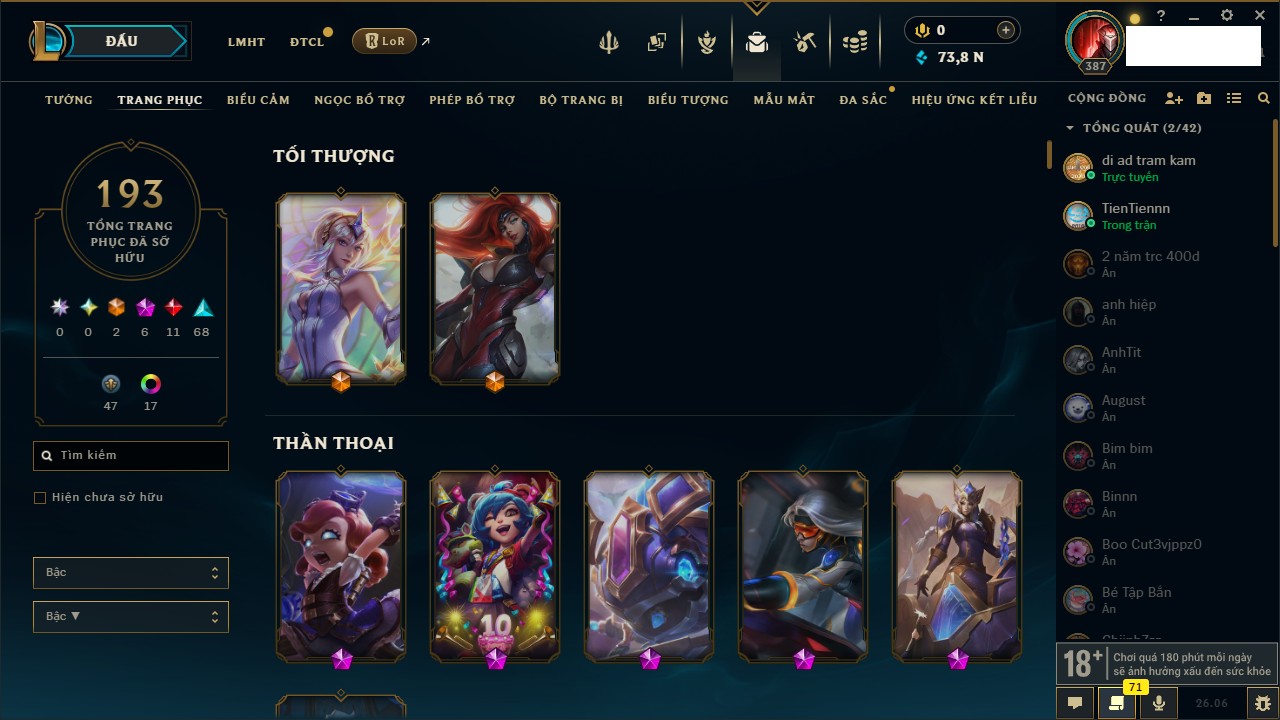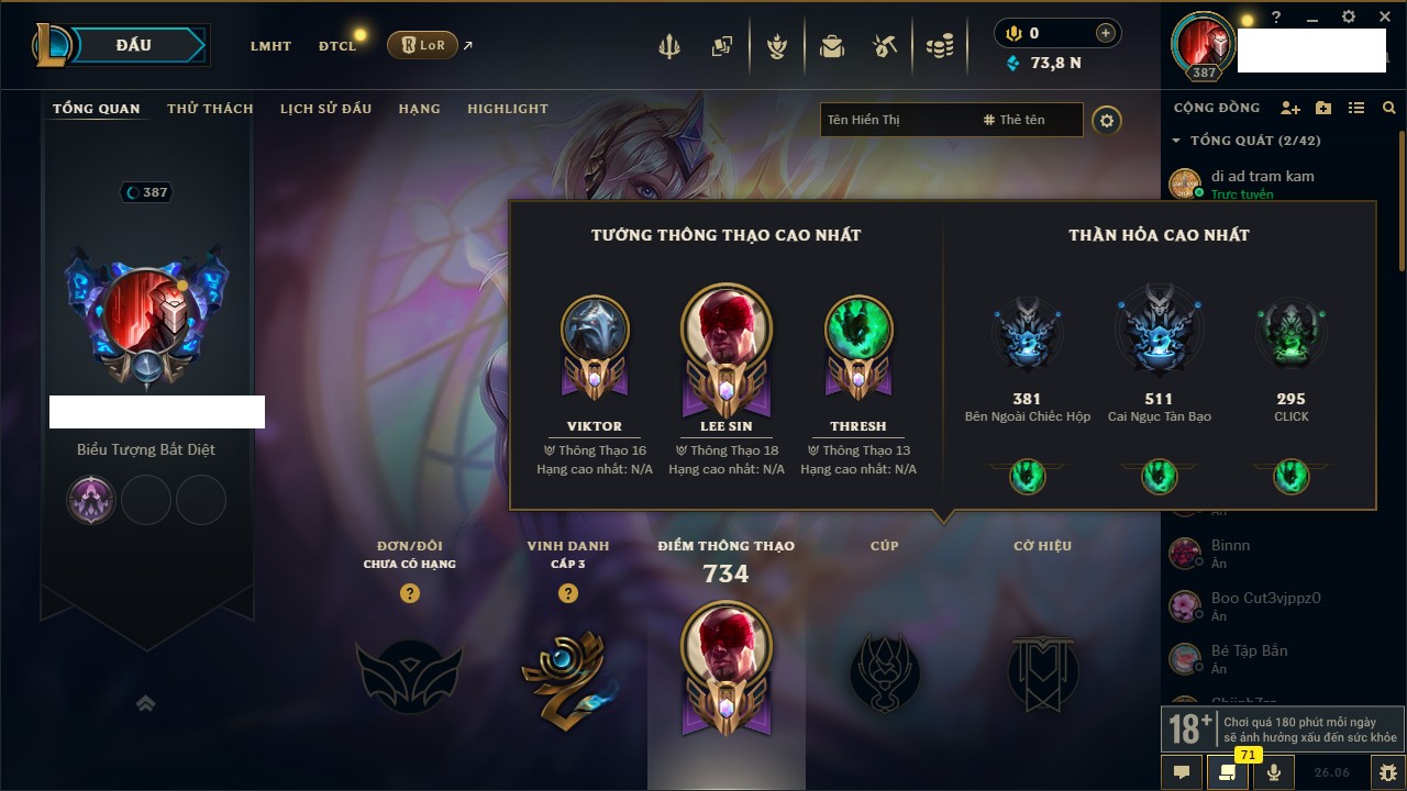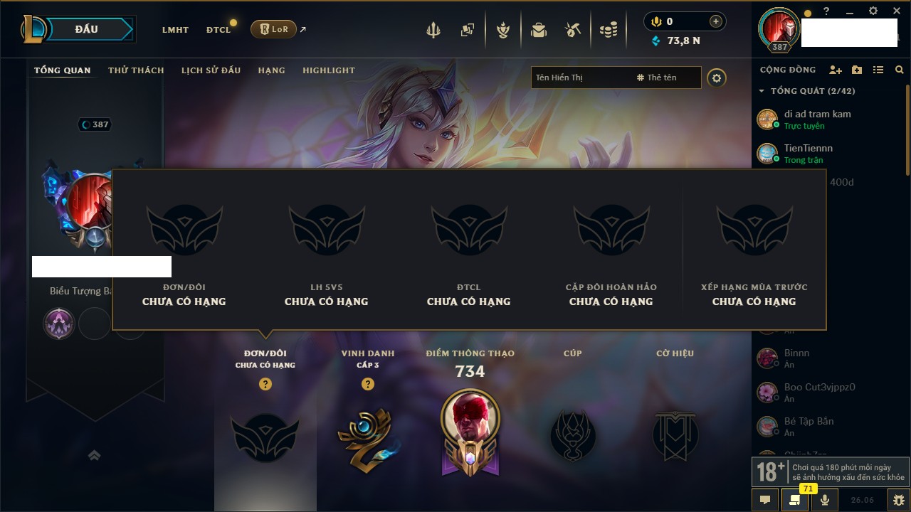 Rank Đơn: Chưa RankKhung: Chưa có khungTướng: 158 - Còn 73878 THXTrang Phục: 193Rank ĐTCL: Chưa RankLinh Thú: 8