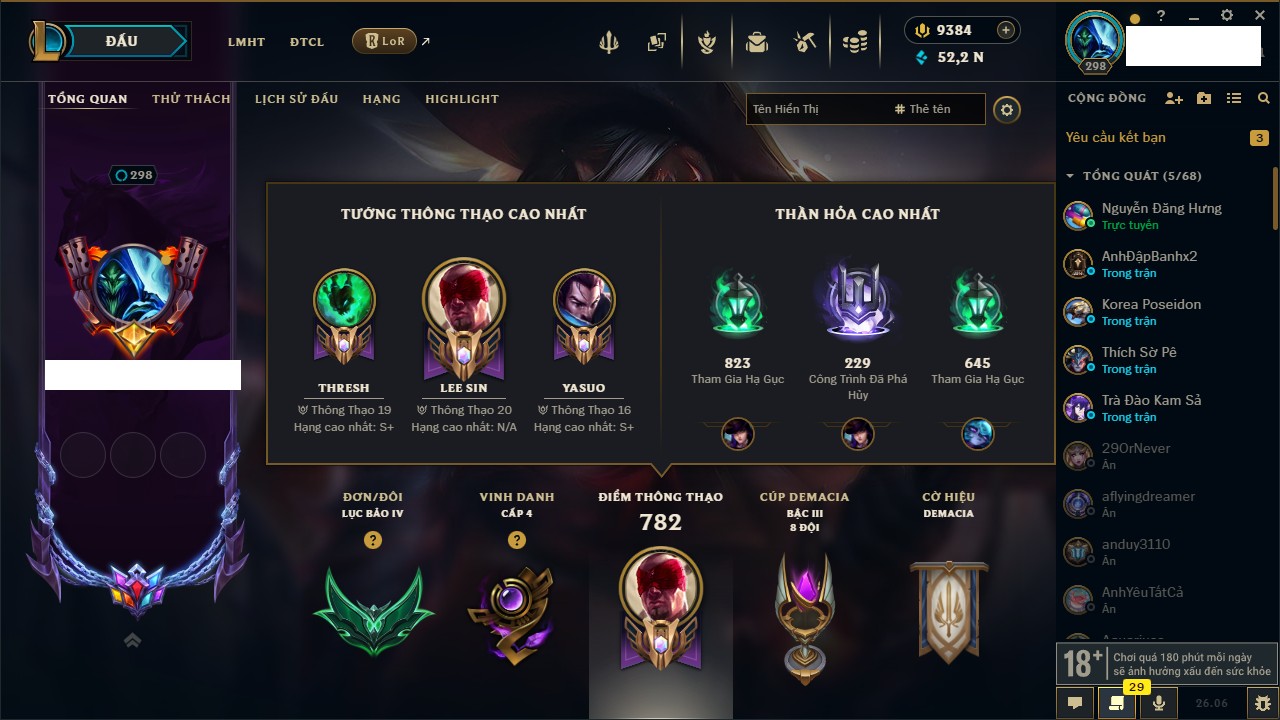 Rank Đơn: Bạch Kim III Khung: Bạch kim Tướng: 172 - Còn 38276 THX Trang Phục: 948 Rank ĐTCL: Lục Bảo IV Linh Thú: 539