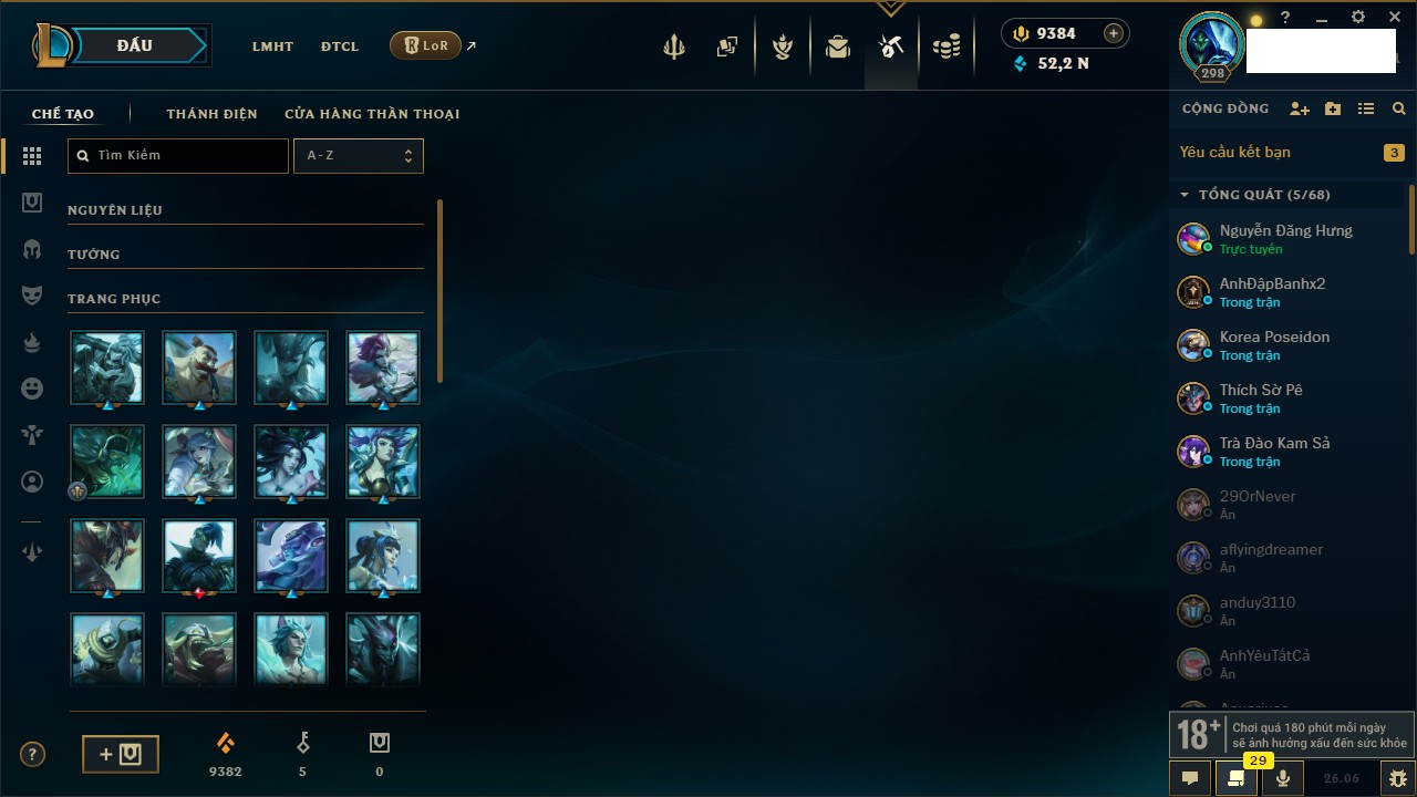 Rank Đơn: Chưa rank mùa nào Khung: Chưa có khung Tướng: 62 - Còn 5995 THX Trang Phục: 3 Rank ĐTCL: Chưa rank mùa nào Linh Thú: 107