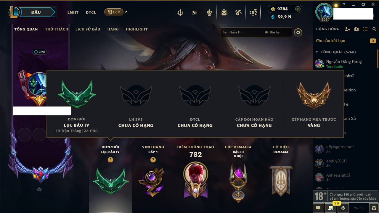Acc #366198: Khung Vàng - Rank Lục Bảo IV