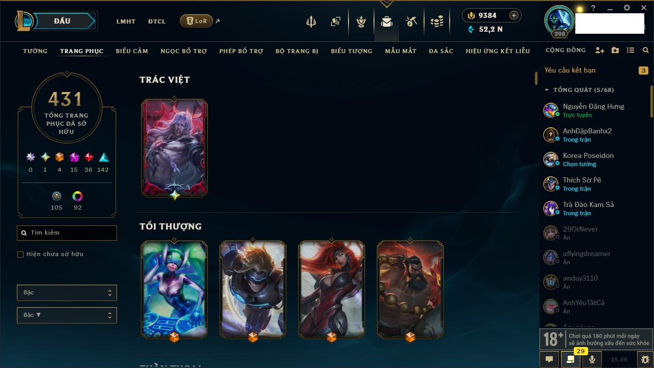 Rank Đơn: Chưa rank mùa nào Khung: Chưa có khung Tướng: 18 - Còn 41519 THX Trang Phục: 4 Rank ĐTCL: Chưa rank mùa nào Linh Thú: 437