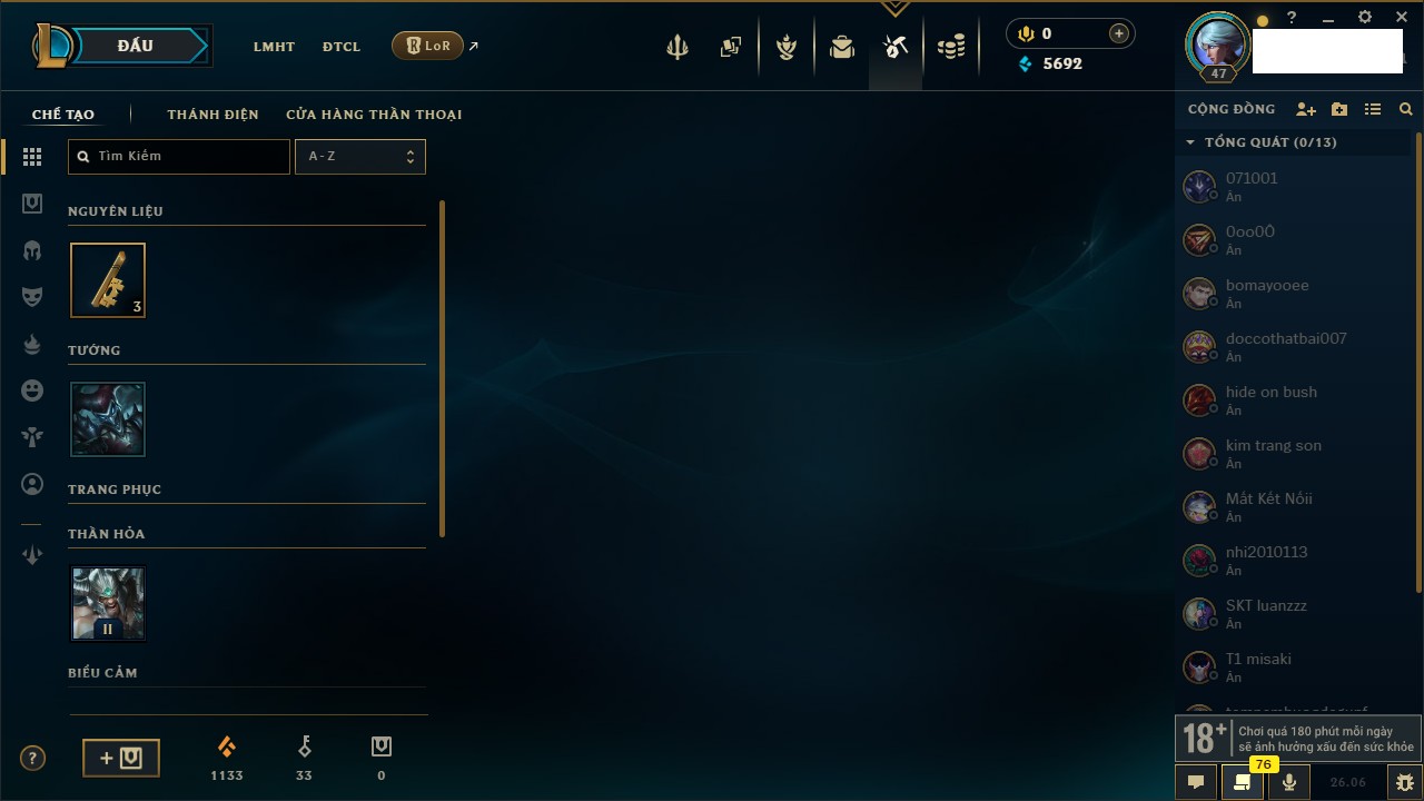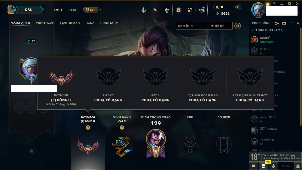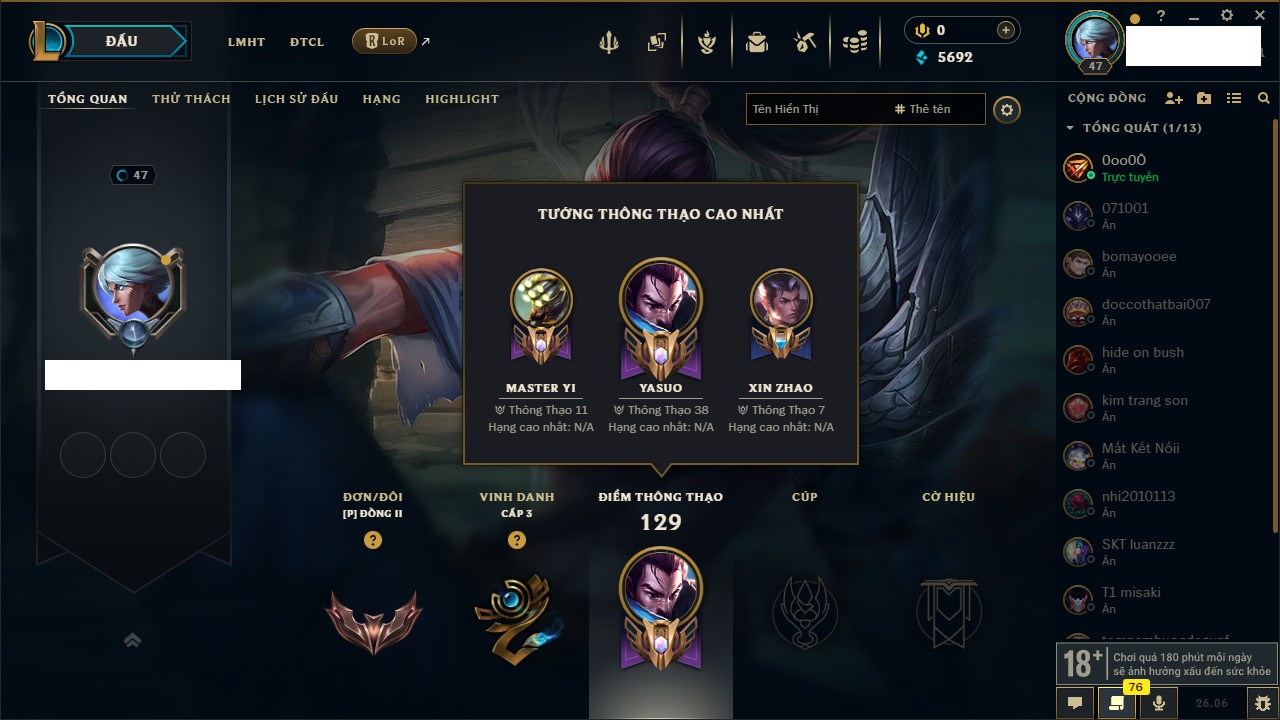 Rank Đơn: Chưa rank mùa nàoKhung: Chưa có khungTướng: 6 - Còn 11600 THXTrang Phục: 0Rank ĐTCL: Chưa rank mùa nàoLinh Thú: 33