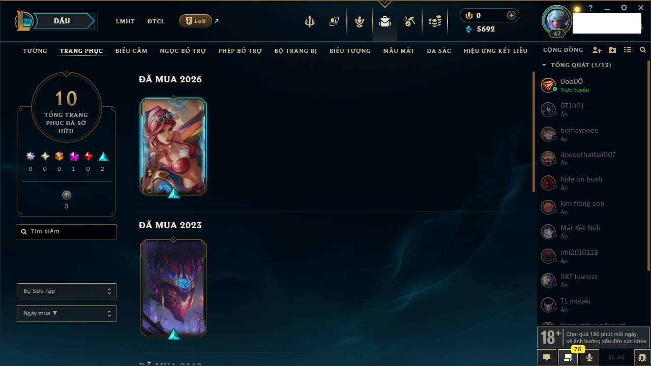 Rank Đơn: Chưa rank mùa nàoKhung: Chưa có khungTướng: 0 - Còn 9000 THXTrang Phục: 0Rank ĐTCL: Chưa rank mùa nàoLinh Thú: 13