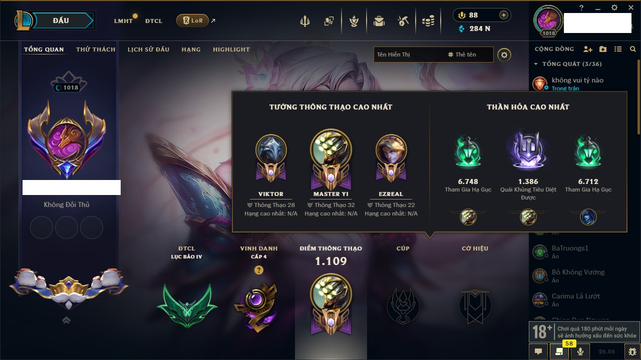 Rank Đơn: Vàng III Khung: Chưa có khung Tướng: 172 - Còn 45354 THX Trang Phục: 622 Rank ĐTCL: Chưa Rank Linh Thú: 87