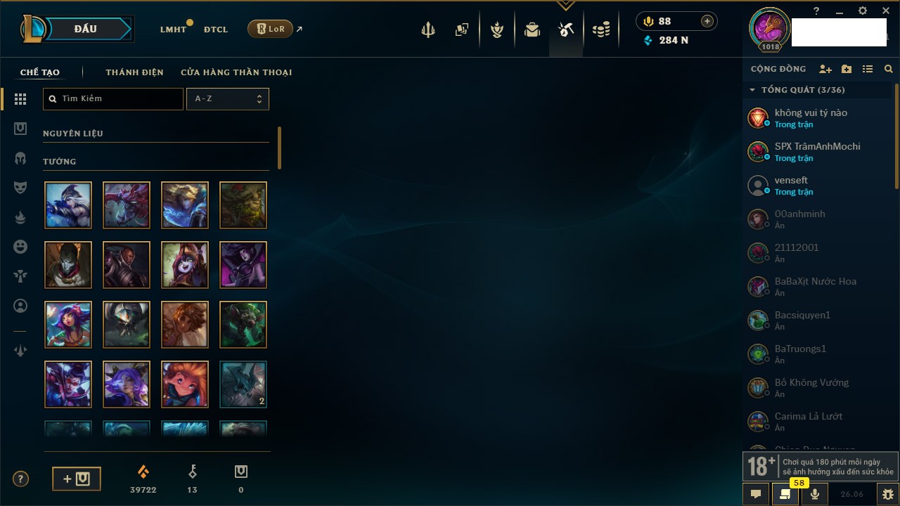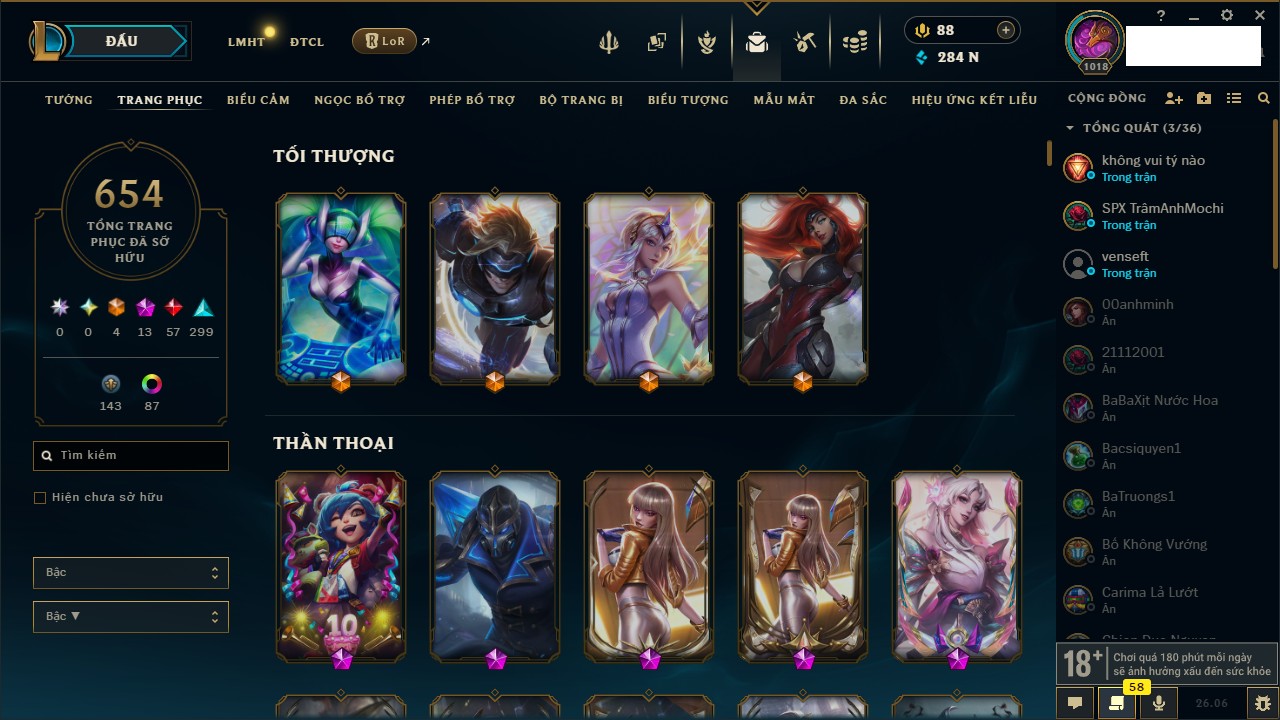 Rank Đơn: Chưa Rank Khung: Vàng Tướng: 172 - Còn 11123 THX Trang Phục: 288 Rank ĐTCL: Chưa Rank Linh Thú: 117