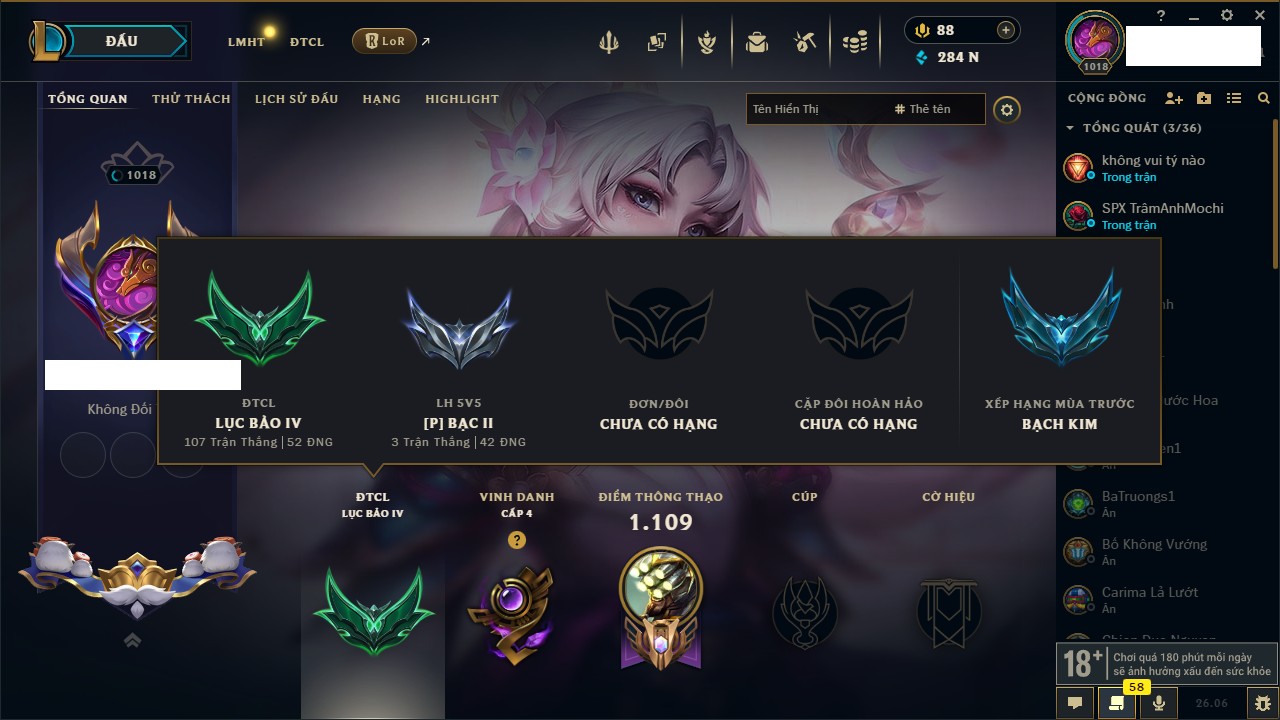 Rank Đơn: Chưa Rank Khung: Bạc Tướng: 172 - Còn 20961 THX Trang Phục: 82 Rank ĐTCL: Bạch Kim IV Linh Thú: 264