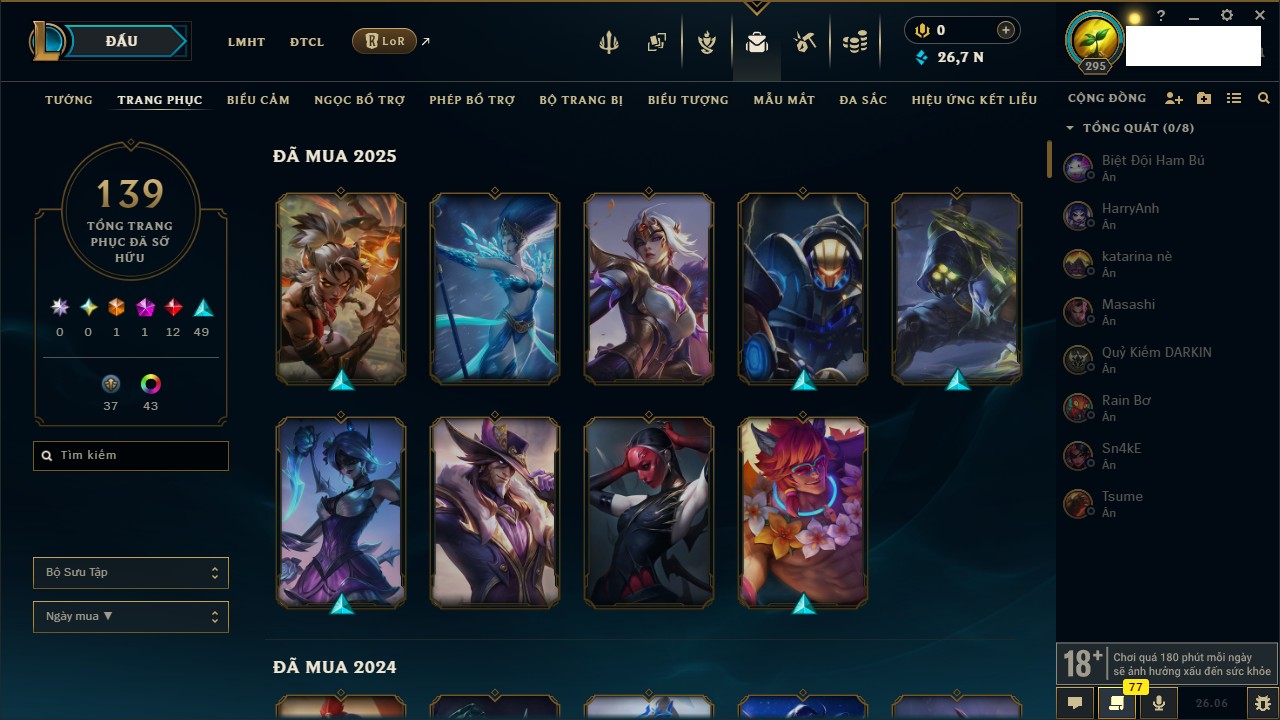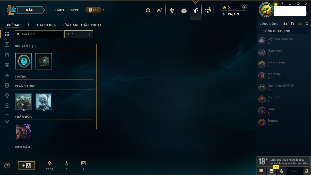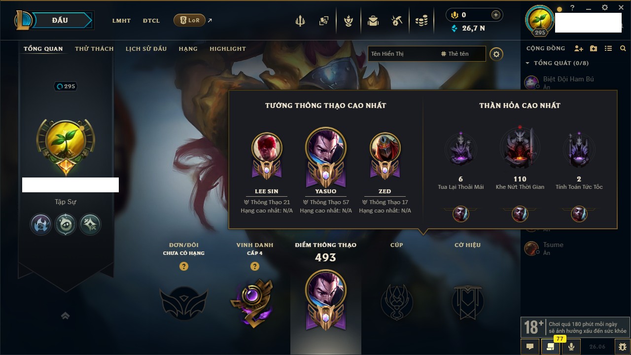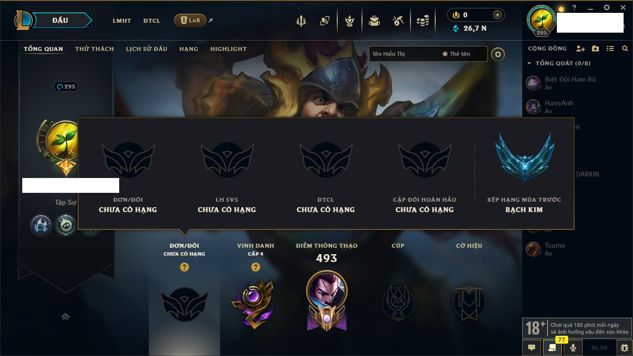 Rank Đơn: Chưa RankKhung: Bạch kimTướng: 161 - Còn 26795 THXTrang Phục: 139Rank ĐTCL: Chưa RankLinh Thú: 56