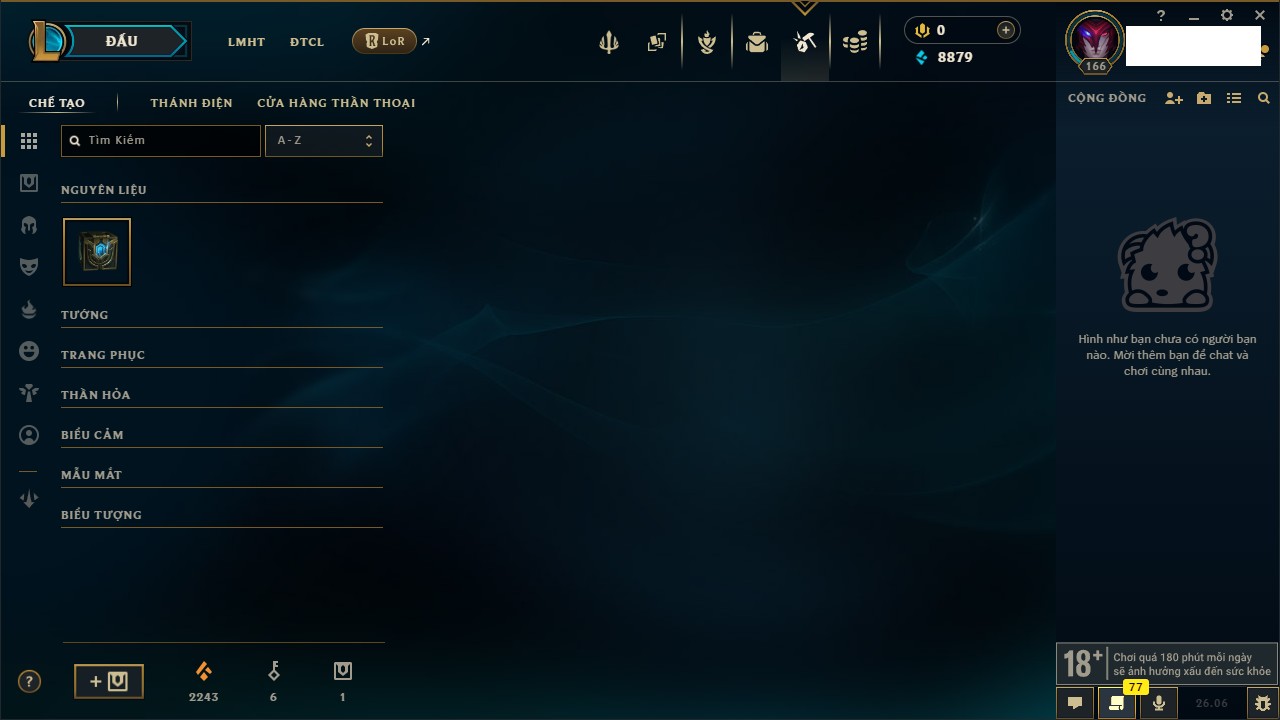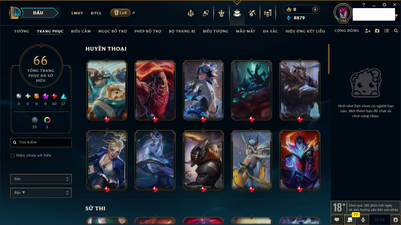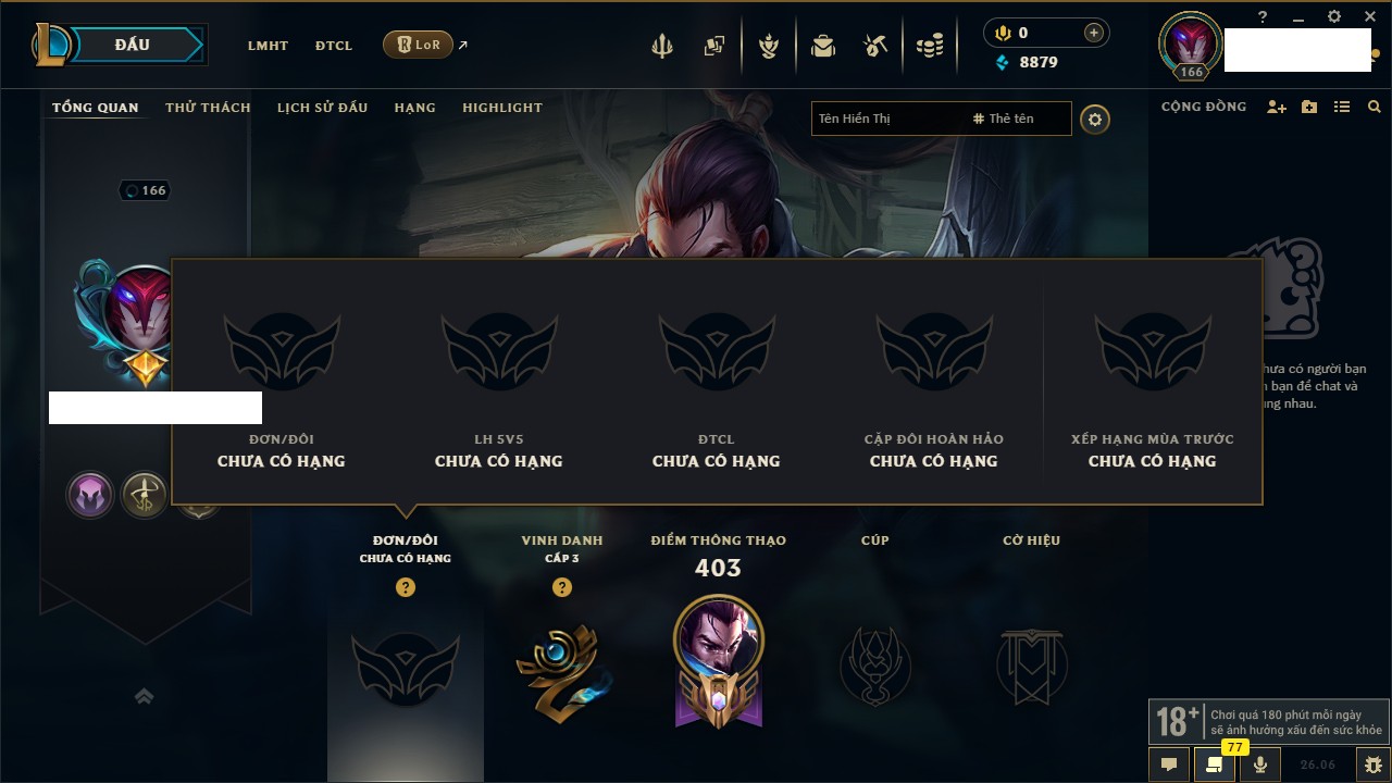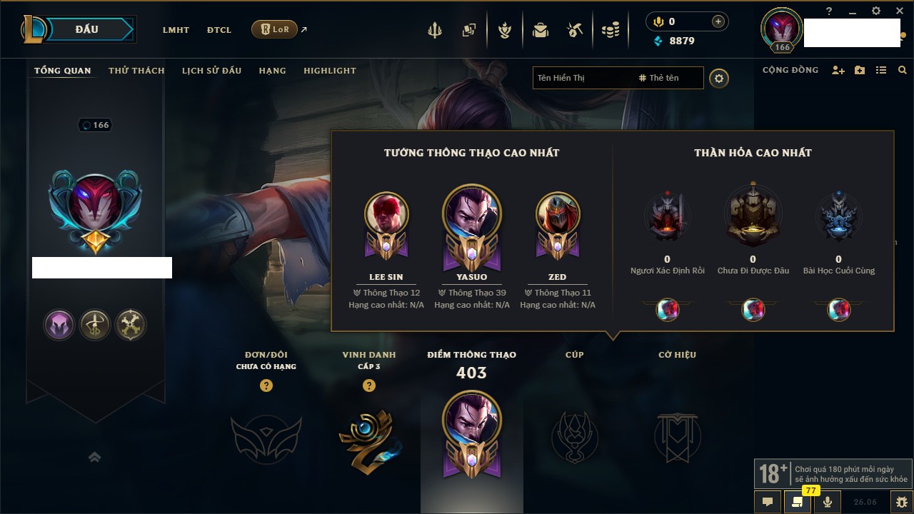 Rank Đơn: Chưa RankKhung: Chưa có khungTướng: 162 - Còn 8879 THXTrang Phục: 66Rank ĐTCL: Chưa RankLinh Thú: 20