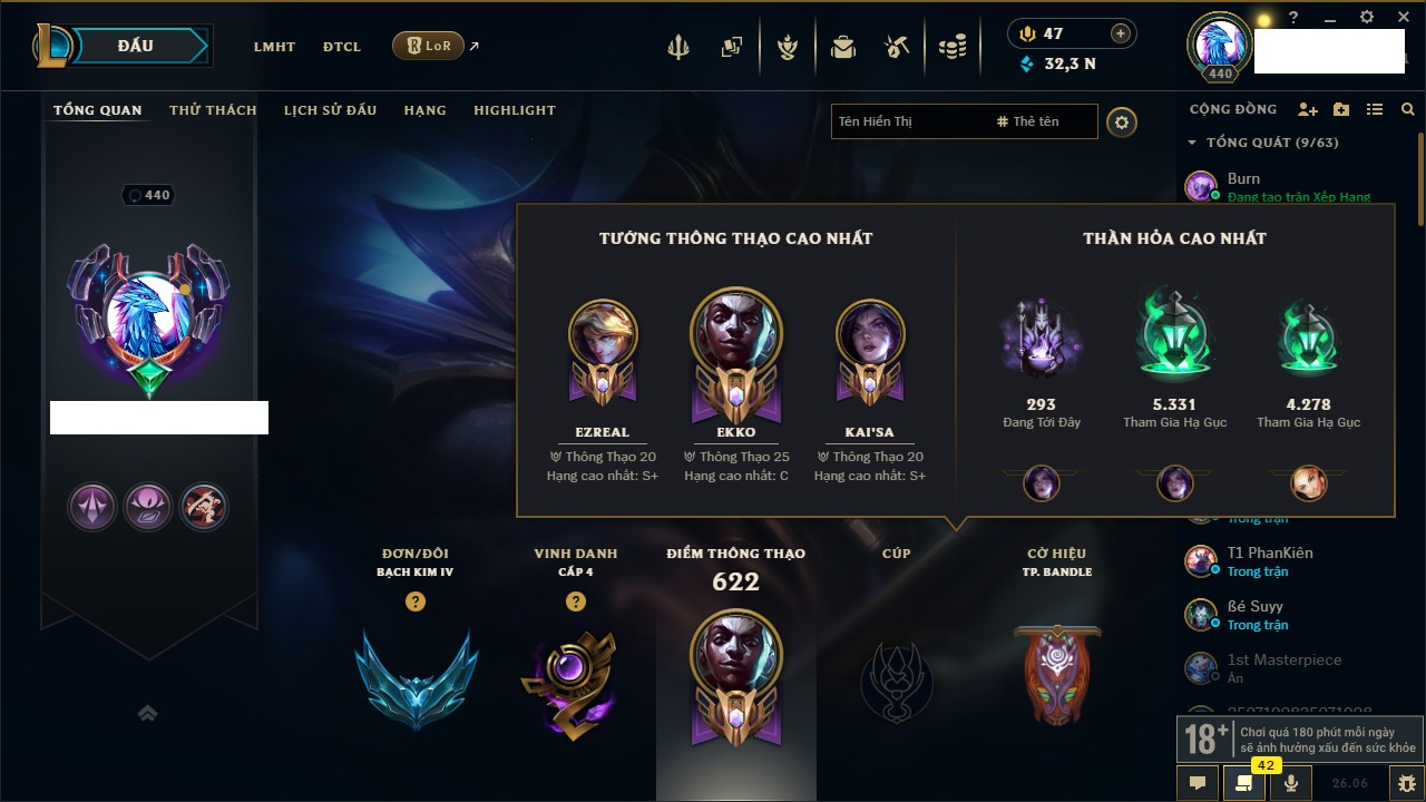 Rank Đơn: Bạch Kim IVKhung: Chưa có khungTướng: 172 - Còn 32357 THXTrang Phục: 232Rank ĐTCL: Chưa RankLinh Thú: 30