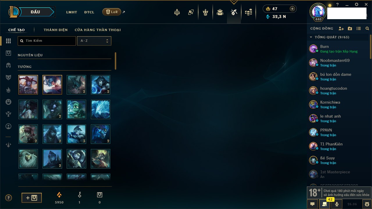 Rank Đơn: Chưa RankKhung: Bạch kimTướng: 172 - Còn 867 THXTrang Phục: 242Rank ĐTCL: Chưa RankLinh Thú: 162