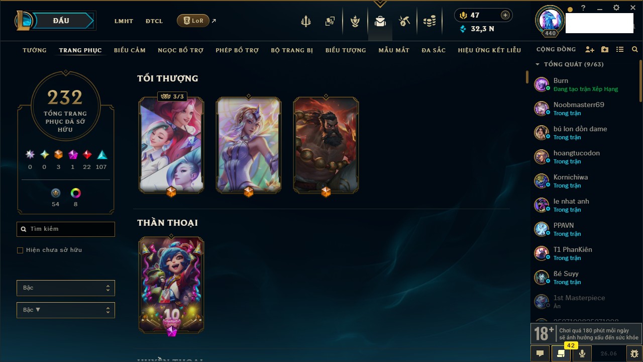 Rank Đơn: Chưa RankKhung: Bạch kimTướng: 168 - Còn 83003 THXTrang Phục: 210Rank ĐTCL: Chưa RankLinh Thú: 36