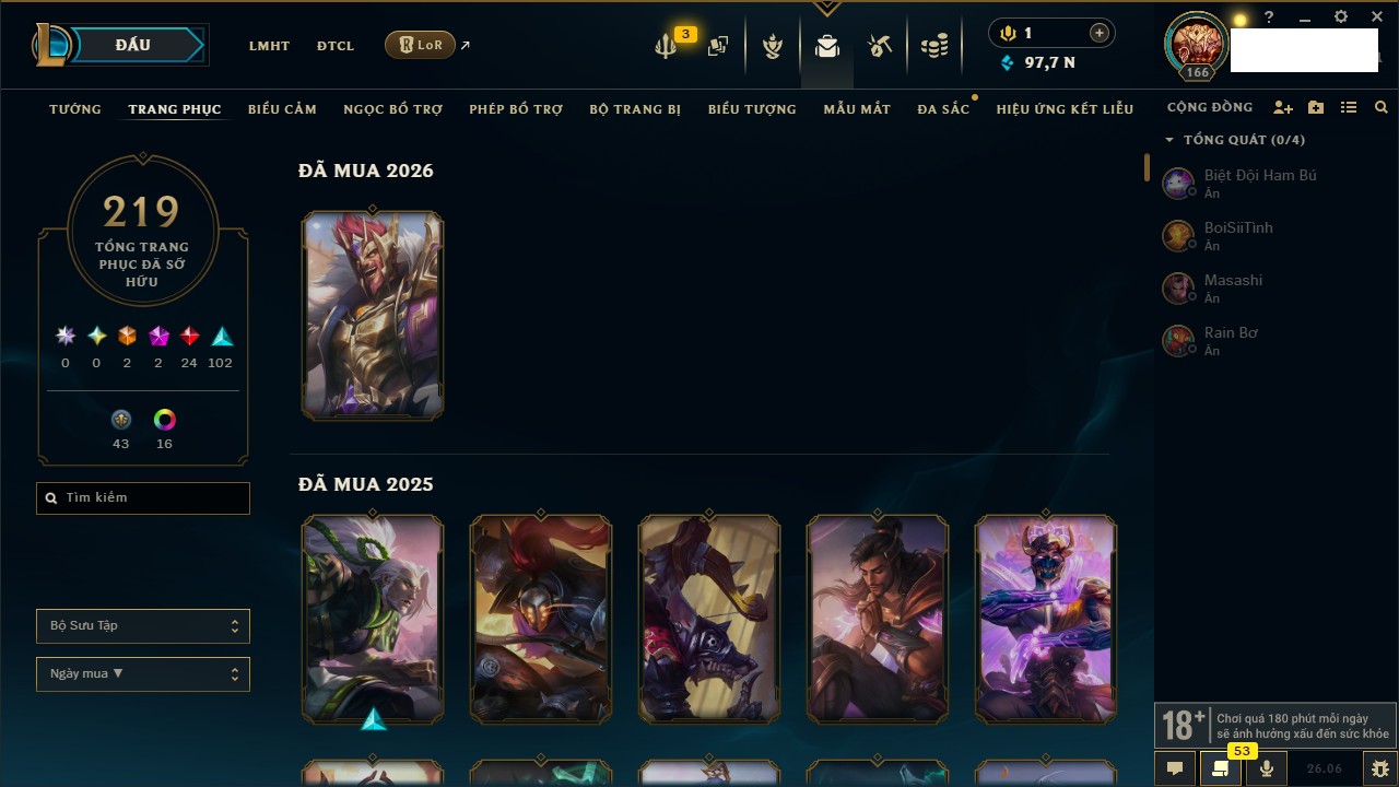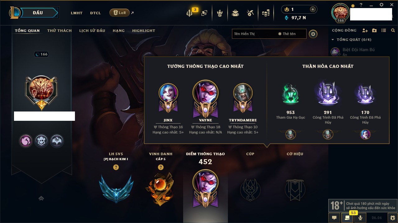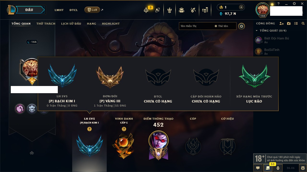 Rank Đơn: Vàng IIIKhung: Bạch kimTướng: 152 - Còn 97790 THXTrang Phục: 219Rank ĐTCL: Chưa RankLinh Thú: 26