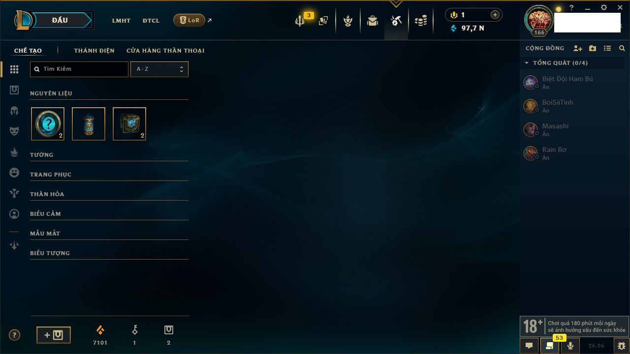 Rank Đơn: Chưa RankKhung: Chưa có khungTướng: 172 - Còn 248311 THXTrang Phục: 233Rank ĐTCL: Chưa RankLinh Thú: 70