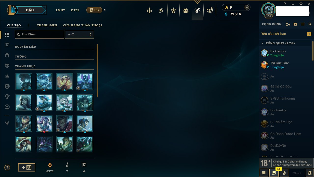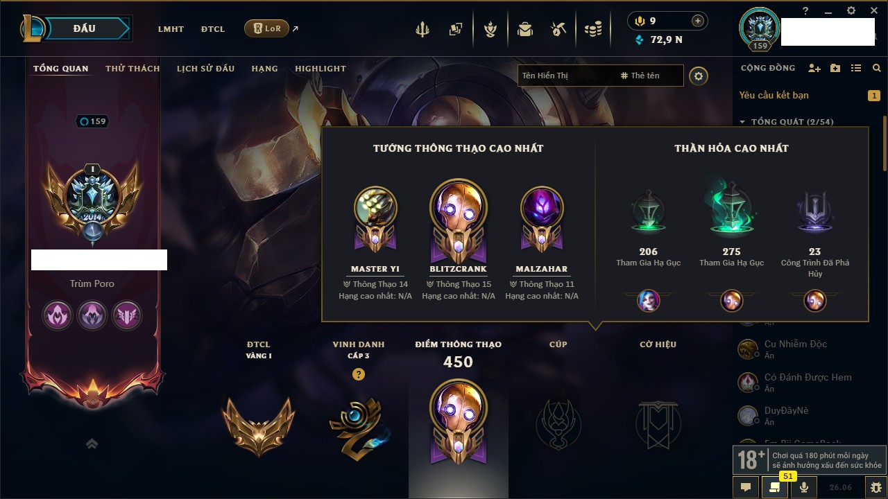 Rank Đơn: Chưa RankKhung: Chưa có khungTướng: 171 - Còn 827961 THXTrang Phục: 193Rank ĐTCL: Chưa RankLinh Thú: 63