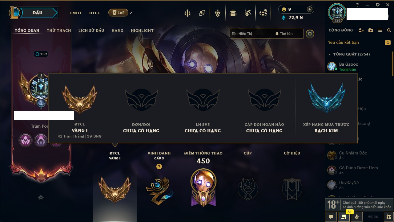 Rank Đơn: Vàng IIKhung: Bạch kimTướng: 172 - Còn 83355 THXTrang Phục: 272Rank ĐTCL: Chưa RankLinh Thú: 38
