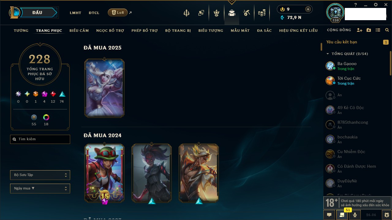 Rank Đơn: Chưa RankKhung: Chưa có khungTướng: 170 - Còn 42144 THXTrang Phục: 82Rank ĐTCL: Chưa RankLinh Thú: 130