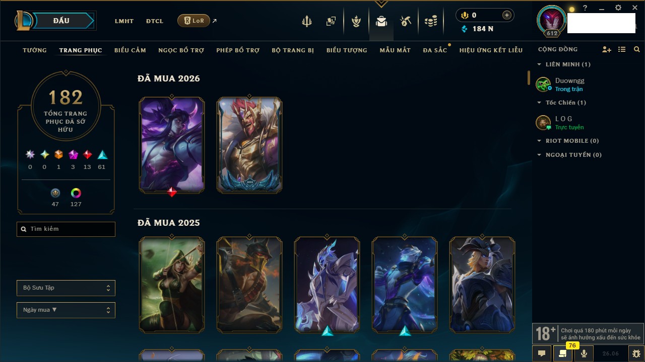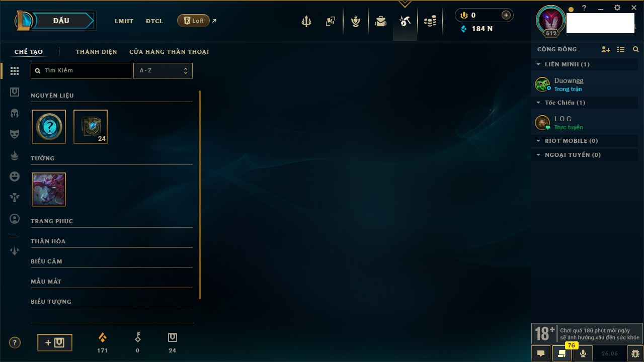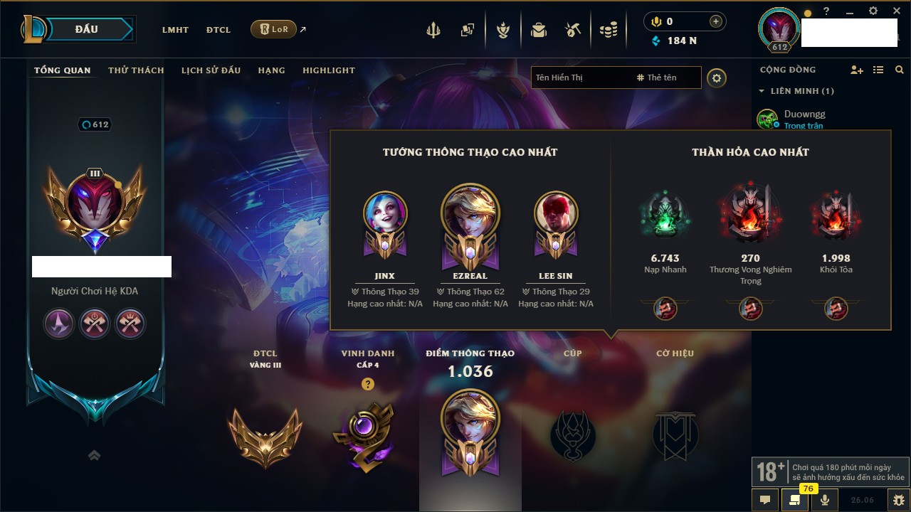 Rank Đơn: Chưa Rank Khung: Chưa có khung Tướng: 105 - Còn 590 THX Trang Phục: 124 Rank ĐTCL: Chưa Rank Linh Thú: 61