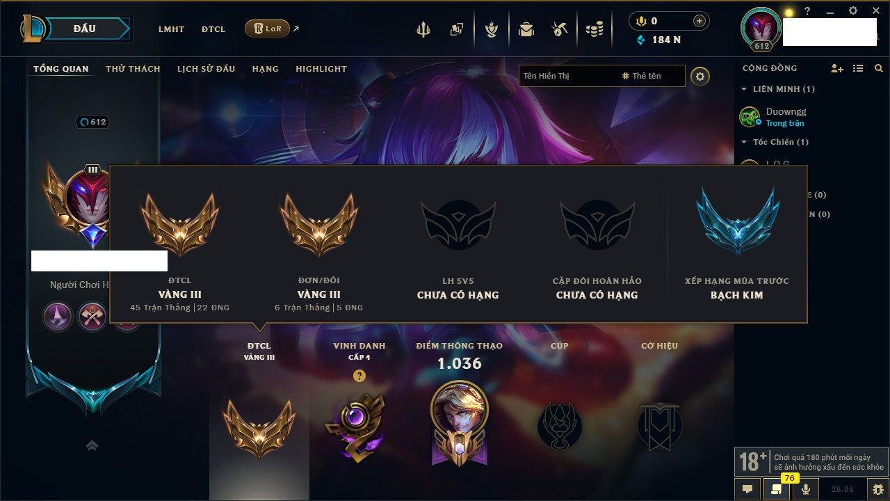 Rank Đơn: Vàng III Khung: Bạch kim Tướng: 172 - Còn 184893 THX Trang Phục: 182 Rank ĐTCL: Vàng III Linh Thú: 86