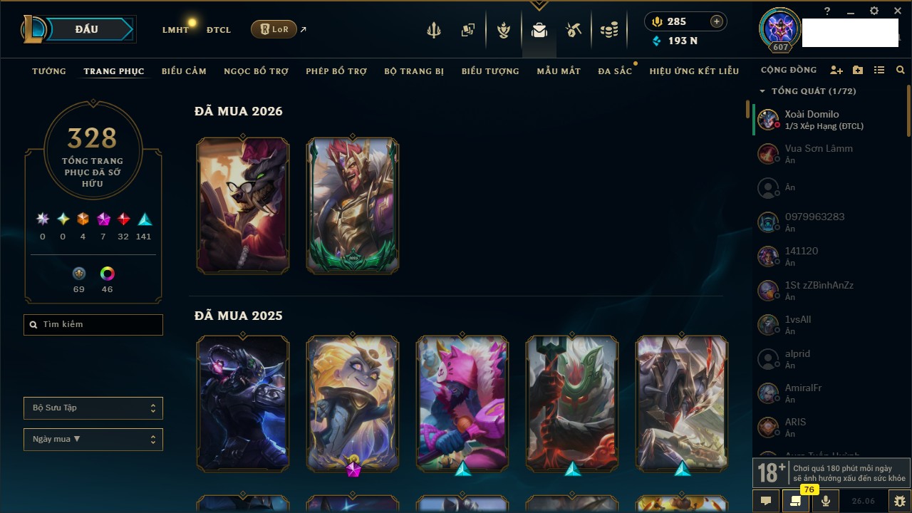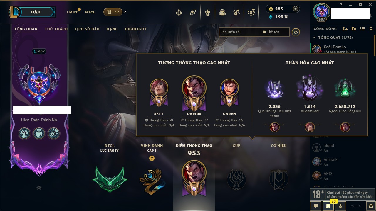 Rank Đơn: Chưa rank mùa nào Khung: Chưa có khung Tướng: 11 - Còn 28690 THX Trang Phục: 0 Rank ĐTCL: Rank Cao Thủ Linh Thú: 101