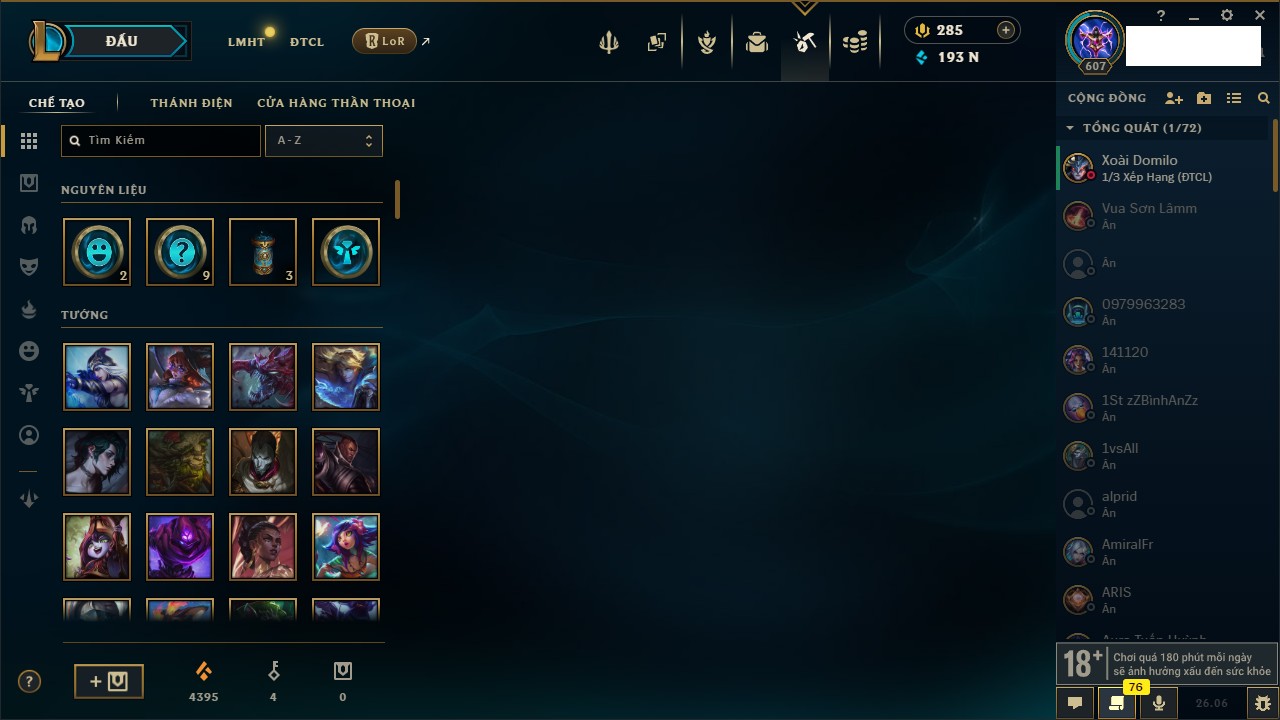 Rank Đơn: Chưa Rank Khung: Vàng Tướng: 172 - Còn 11123 THX Trang Phục: 288 Rank ĐTCL: Chưa Rank Linh Thú: 117