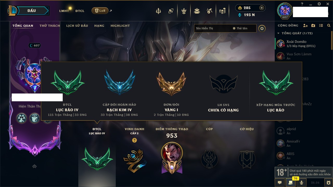 Rank Đơn: Lục Bảo IV Khung: Bạch kim Tướng: 172 - Còn 210811 THX Trang Phục: 674 Rank ĐTCL: Chưa Rank Linh Thú: 319