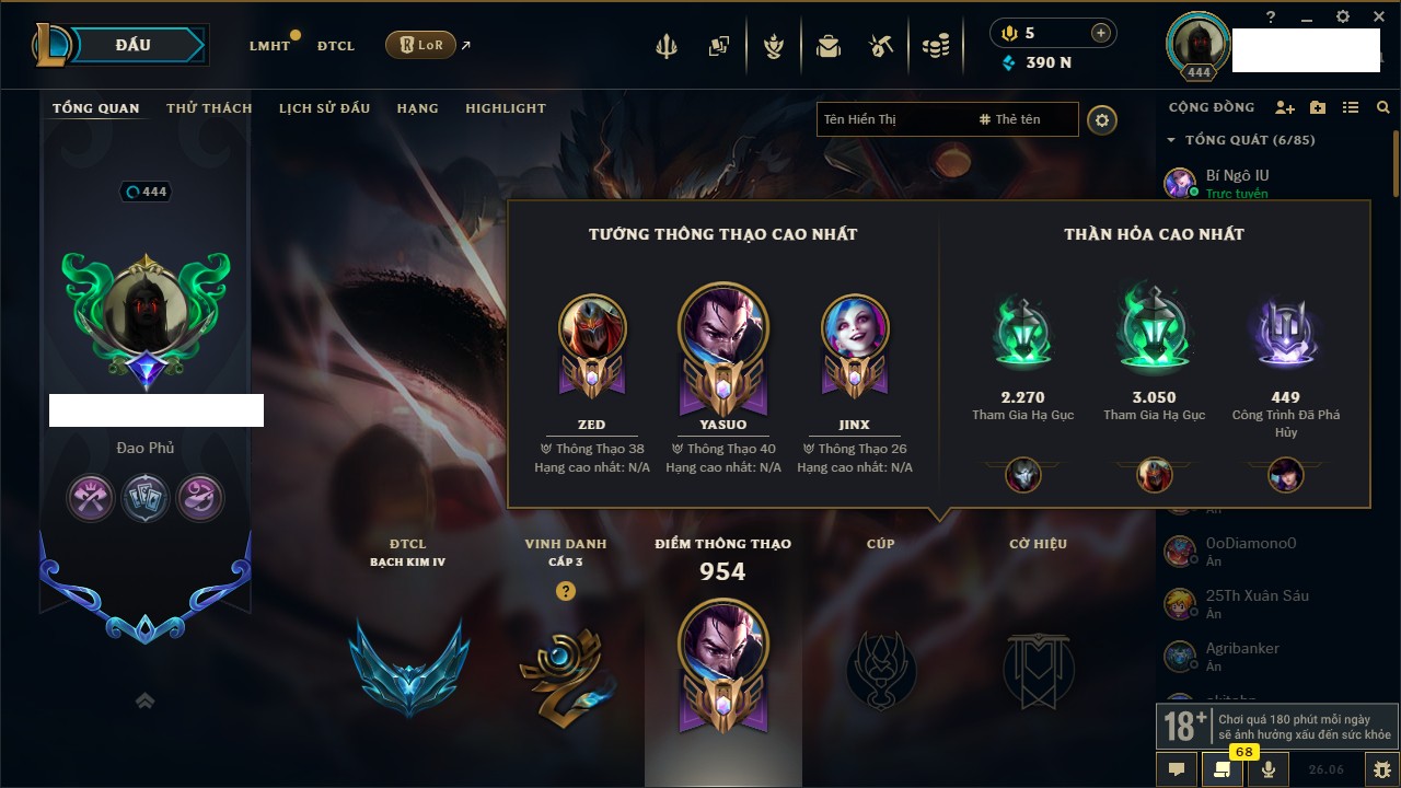 Rank Đơn: Chưa RankKhung: VàngTướng: 171 - Còn 88634 THXTrang Phục: 198Rank ĐTCL: Chưa RankLinh Thú: 86