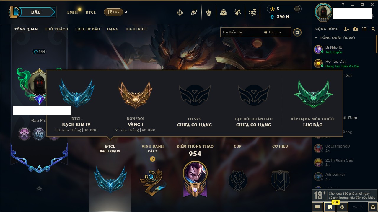 Rank Đơn: Vàng IKhung: Chưa có khungTướng: 172 - Còn 390689 THXTrang Phục: 194Rank ĐTCL: Bạch Kim IVLinh Thú: 97