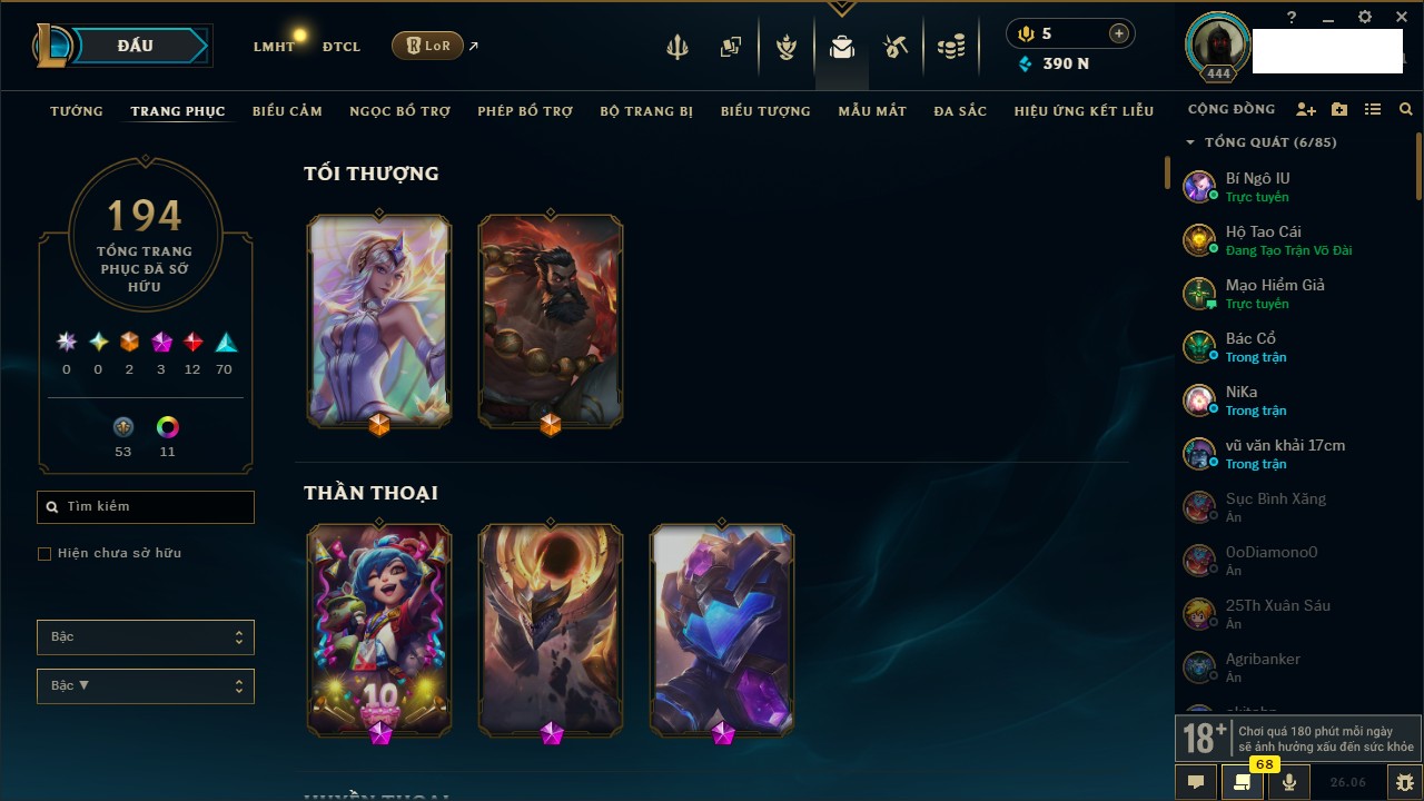 Rank Đơn: Chưa RankKhung: VàngTướng: 171 - Còn 70460 THXTrang Phục: 169Rank ĐTCL: Chưa RankLinh Thú: 46