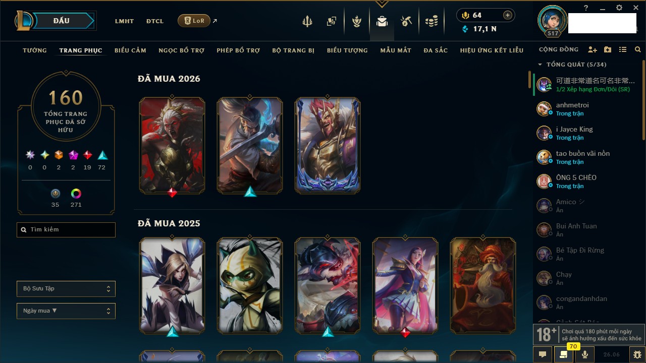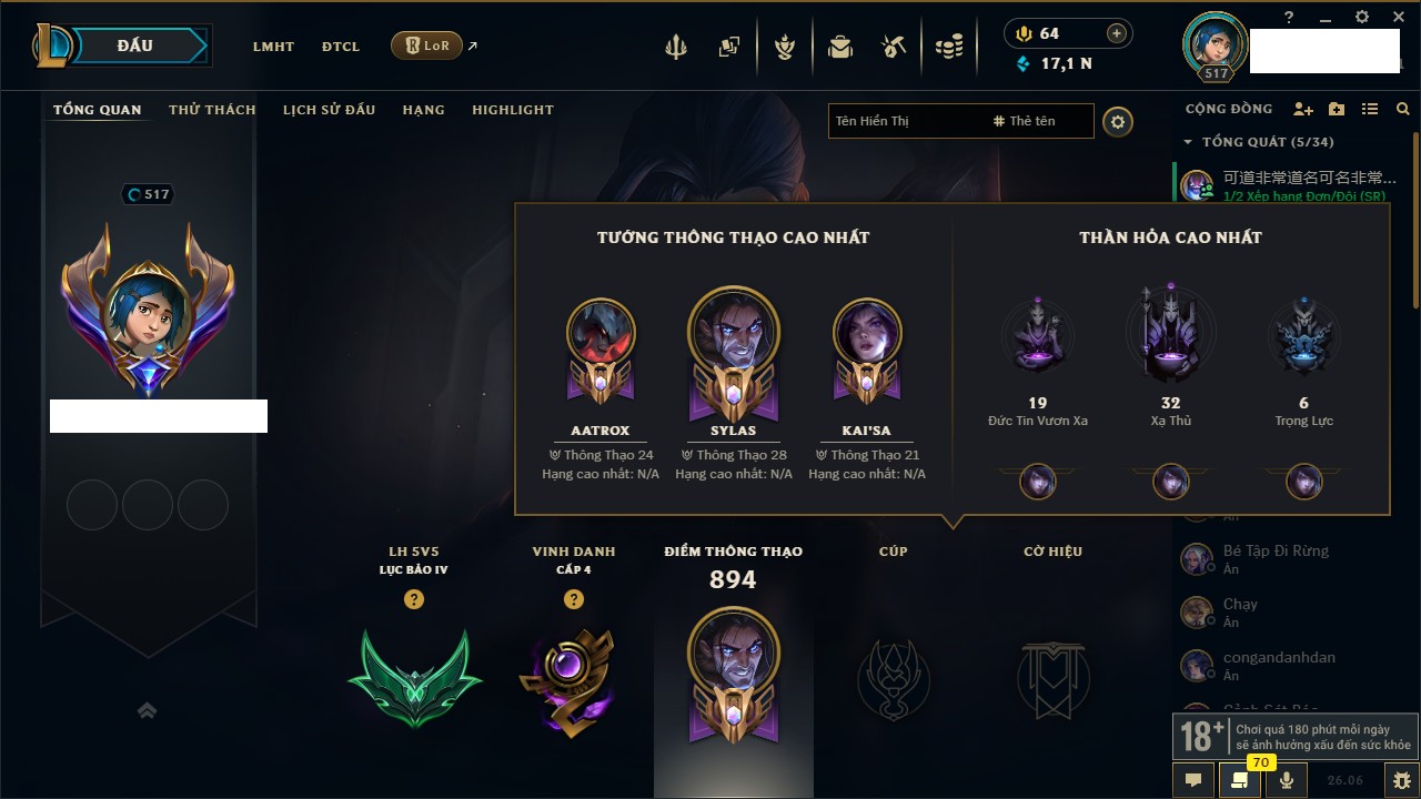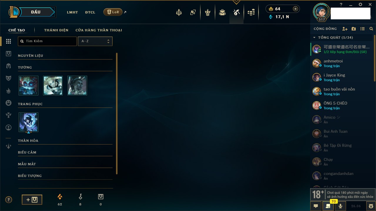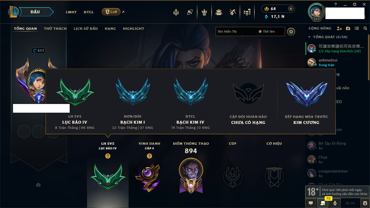 Rank Đơn: Vàng IIIKhung: Bạch kimTướng: 152 - Còn 97790 THXTrang Phục: 219Rank ĐTCL: Chưa RankLinh Thú: 26