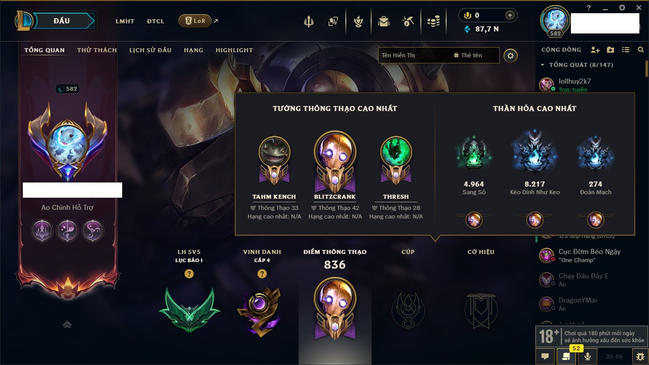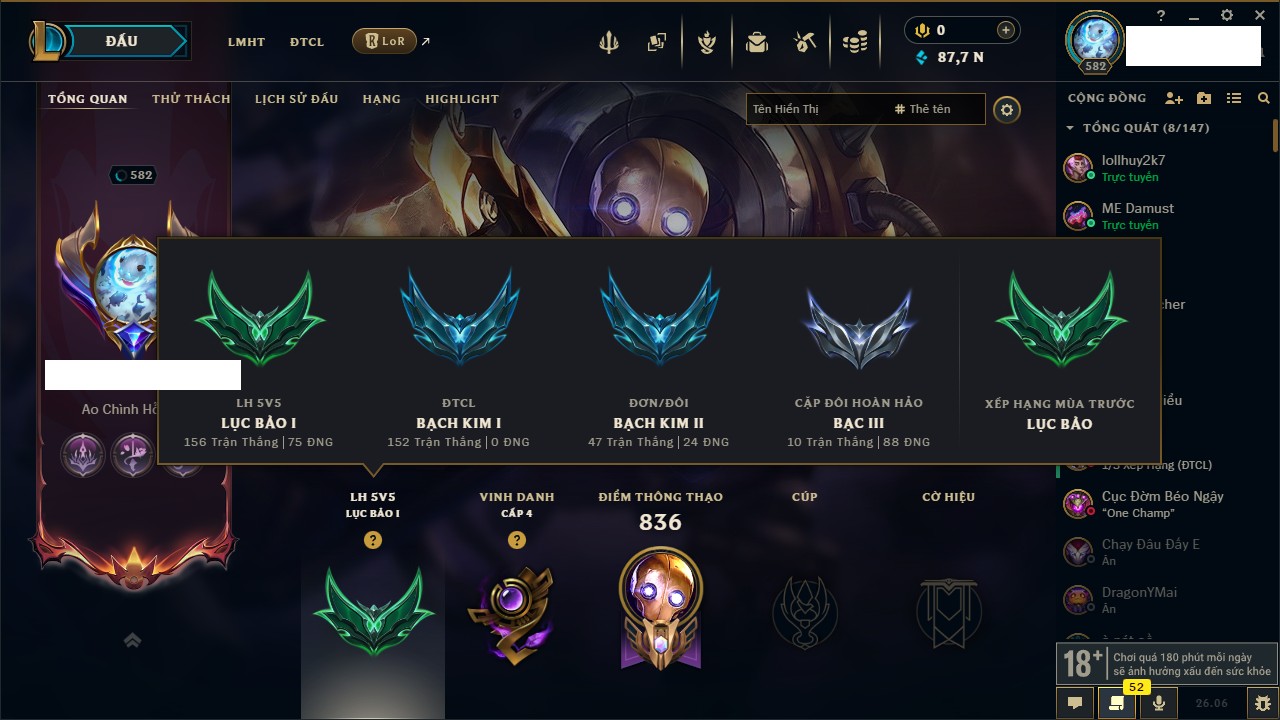 Rank Đơn: Bạch Kim IVKhung: Chưa có khungTướng: 166 - Còn 37354 THXTrang Phục: 188Rank ĐTCL: Vàng ILinh Thú: 39