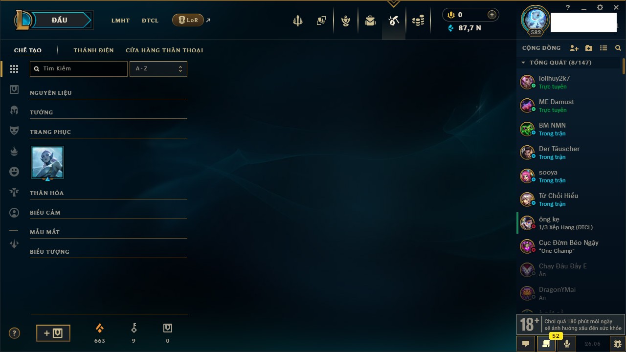 Rank Đơn: Chưa RankKhung: BạcTướng: 171 - Còn 101359 THXTrang Phục: 88Rank ĐTCL: Chưa RankLinh Thú: 200