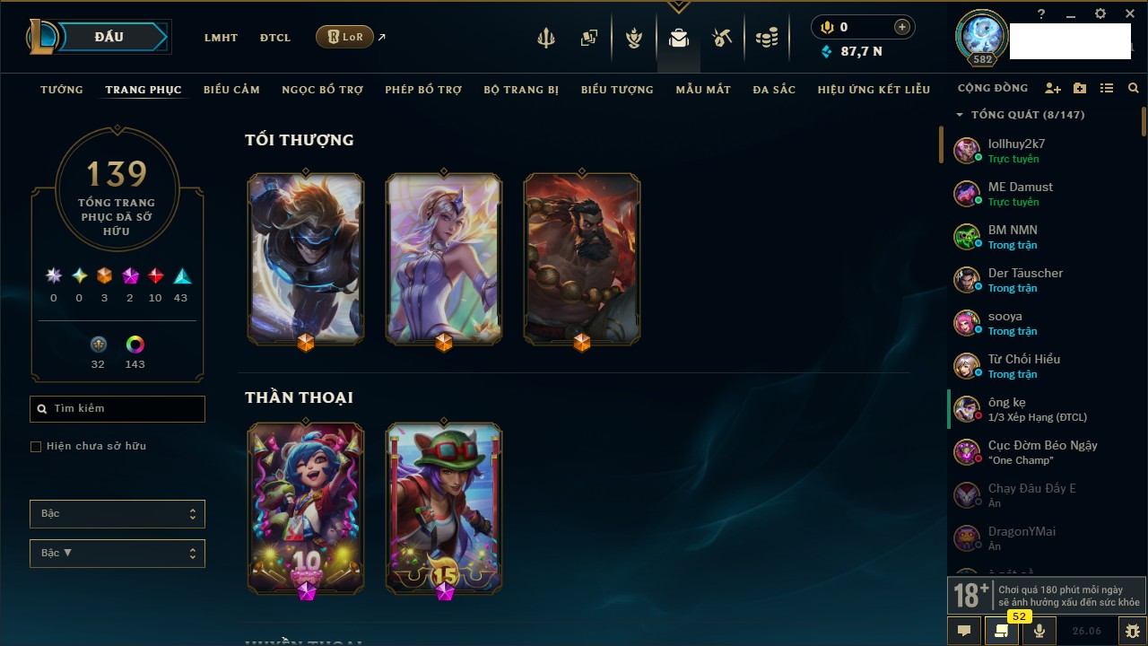 Rank Đơn: Chưa RankKhung: VàngTướng: 143 - Còn 16814 THXTrang Phục: 29Rank ĐTCL: Chưa RankLinh Thú: 91
