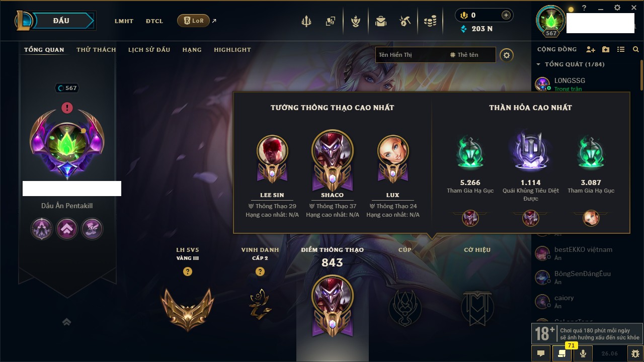 Rank Đơn: Chưa RankKhung: Bạch kimTướng: 172 - Còn 867 THXTrang Phục: 242Rank ĐTCL: Chưa RankLinh Thú: 162