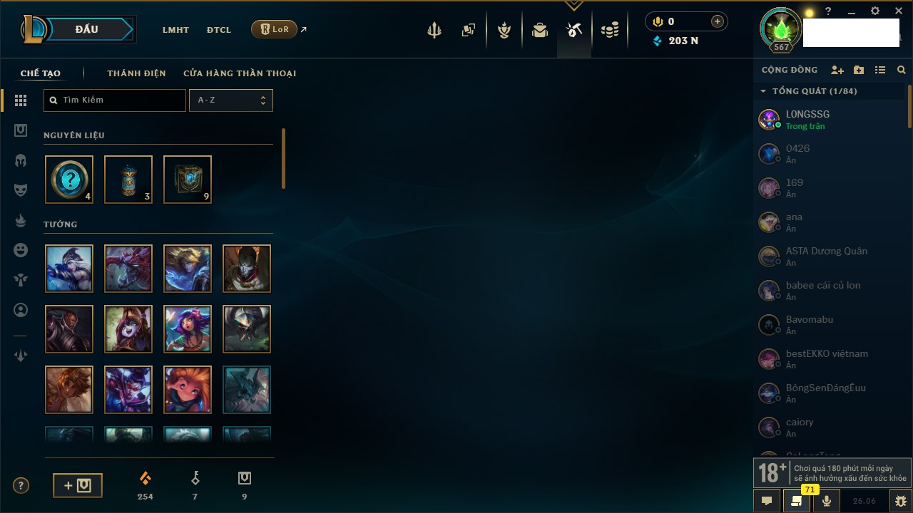 Rank Đơn: Chưa RankKhung: Chưa có khungTướng: 172 - Còn 248311 THXTrang Phục: 233Rank ĐTCL: Chưa RankLinh Thú: 70