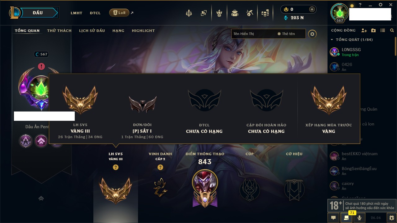 Rank Đơn: Vàng IIIKhung: Bạch kimTướng: 152 - Còn 97790 THXTrang Phục: 219Rank ĐTCL: Chưa RankLinh Thú: 26